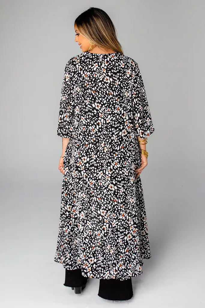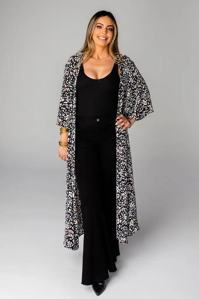 The Alix is our new favorite look. She is a floor length duster with elbow length sleeves and is perfect paired with a tank top, skinny jeans, and booties!