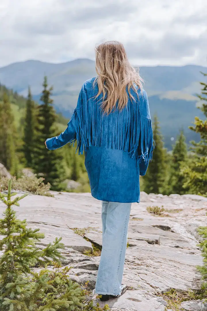 Hey Western babes- this one’s for you! Our suede Dutton jacket is mid thigh length and features fringe detailing. She’s open and flowy and pairs perfectly over a BuddyLove bodysuit!