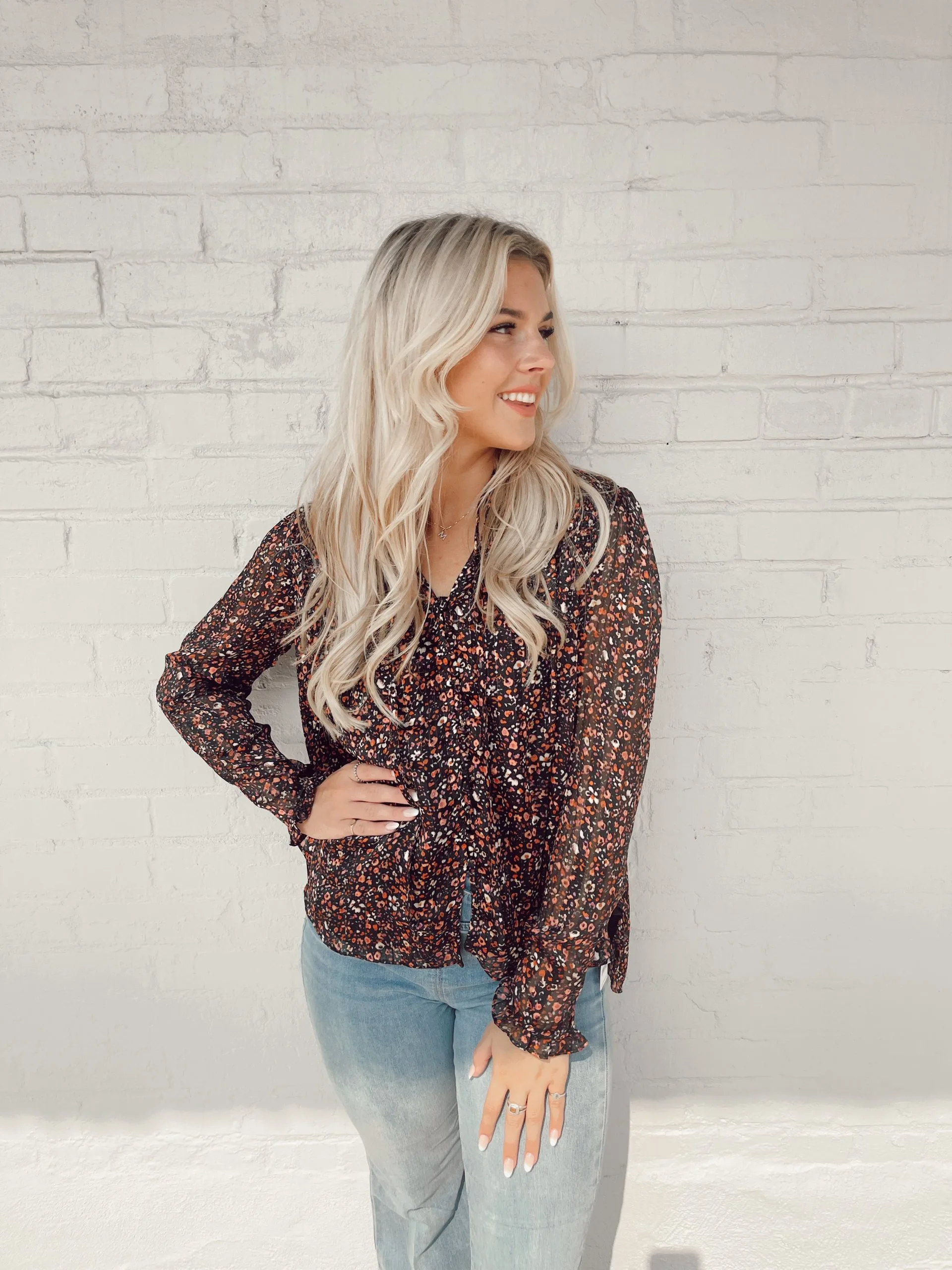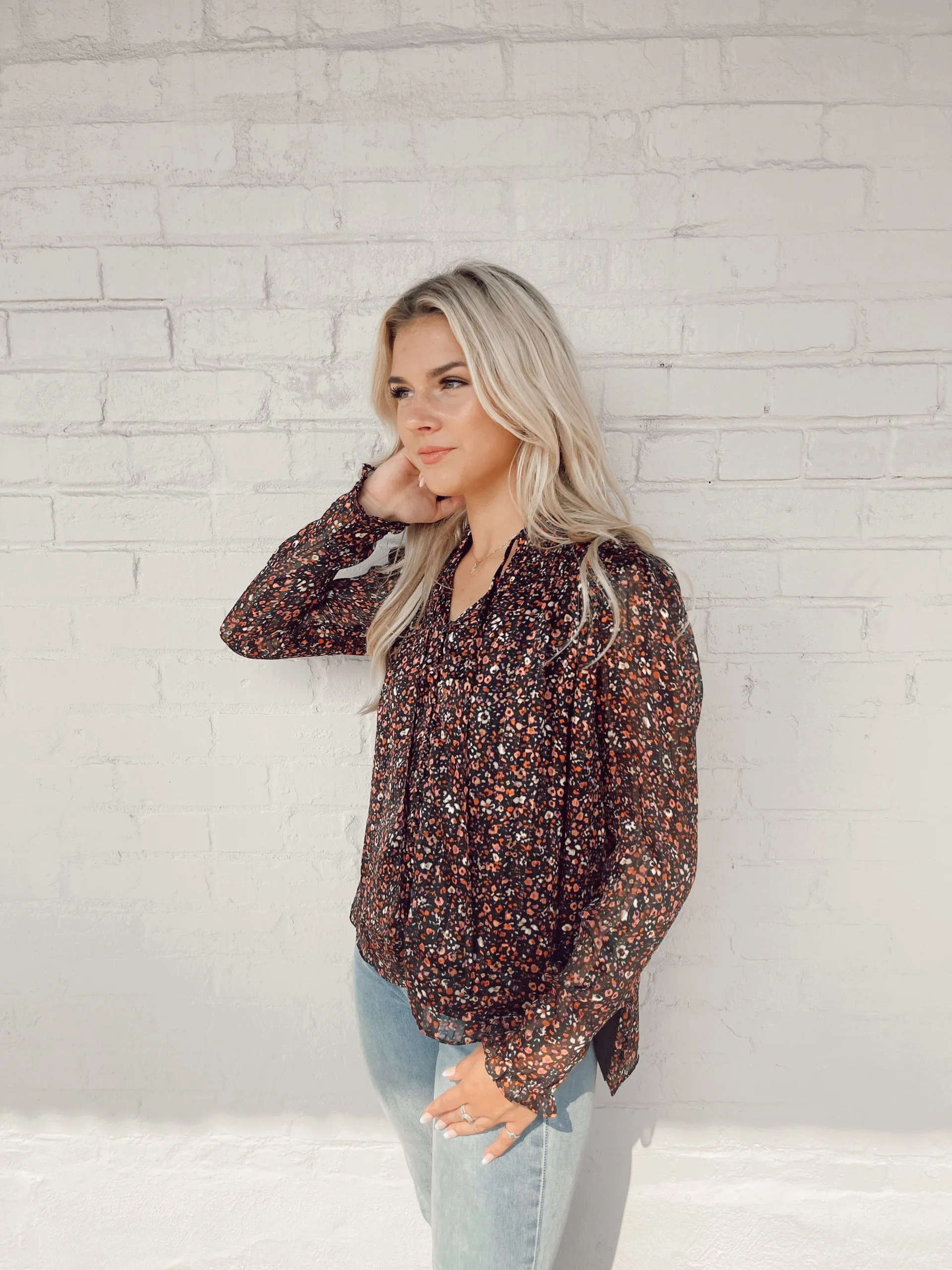 Our Everly Blouse was meant for work and play! She features button down closure, tassels for extra closure, smocking on shoulders for extra room, long sleeves with an elastic trim, and fully lined. Pair her with skinnies and flats for a work look or shorts and booties for a brunch look!