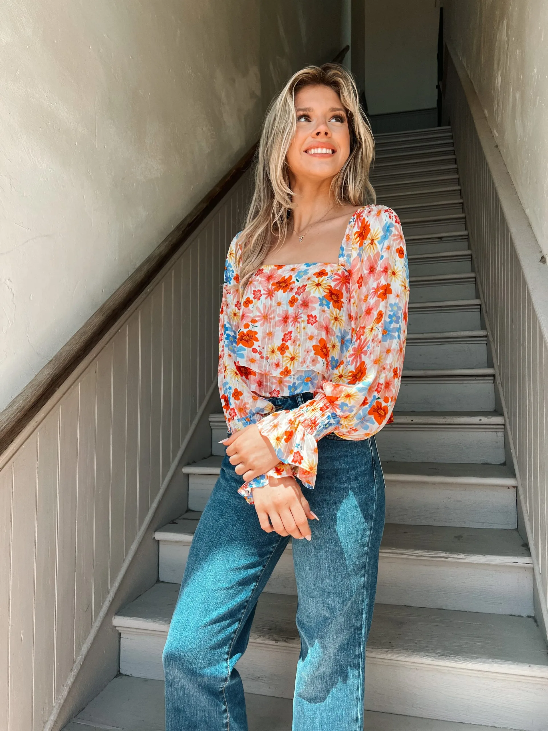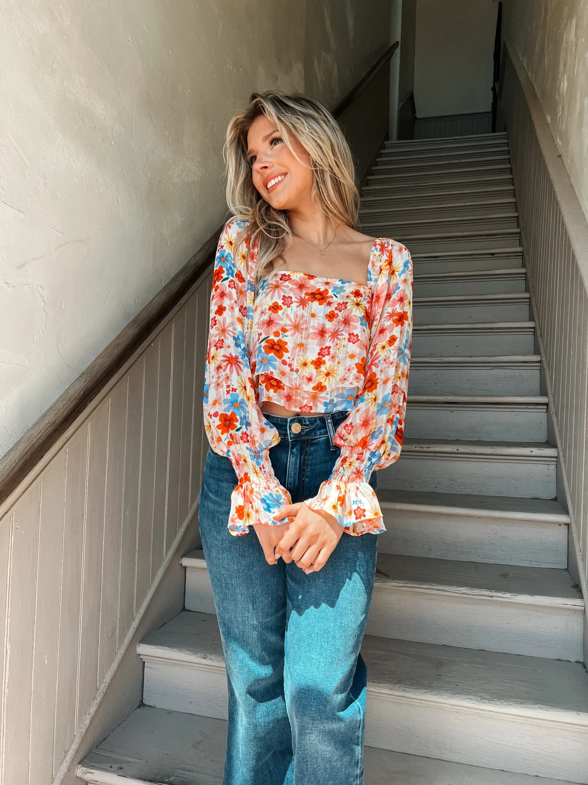 This top is giving us Spring Fever! Compliment your flawless beauty in our new Flora Top featuring long sleeves with smocking at the wrist and flare hem, square neckline, cropped length, and gorgeous Wild Flower print.