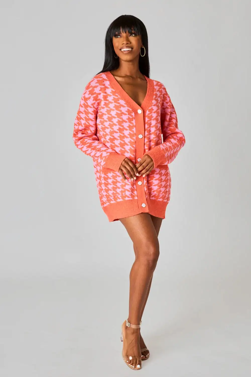 The Twiggy is the perfect 2 in 1! Style her with heels and a statement headband as a mini dress or style her over a bodysuit and leggings as a cardigan! Twiggy features a houndstooth pattern on a knitted material, 2 front functional pockets, and a functional pearl button closure up the front. Either way you wear her, she’s sure to make a statement!