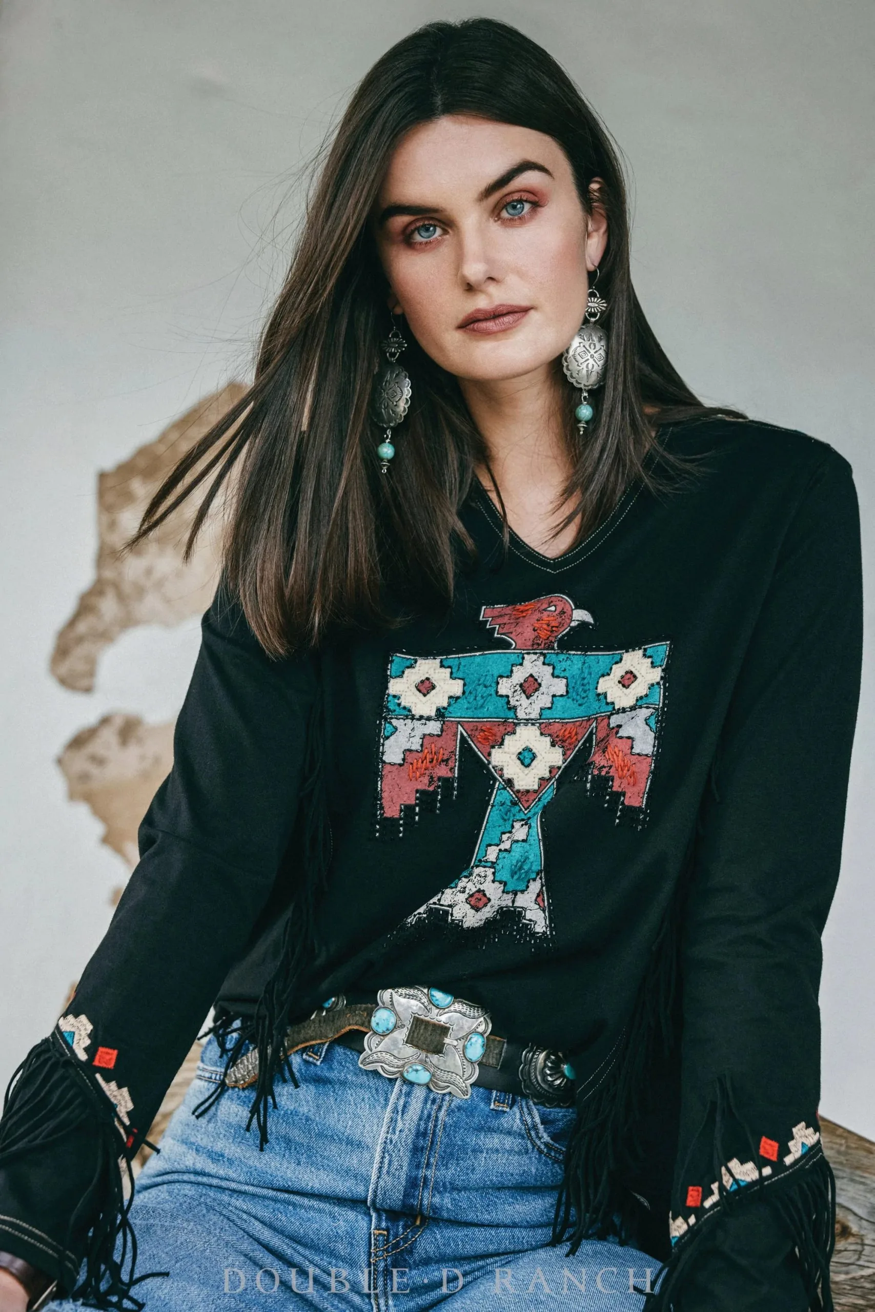 Turn heads and steal hearts in this cool cotton top. The casual long-sleeve top is emblazoned with a bold thunderbird, embellished with embroidery and beadwork, and finished off with fabulous elements of fringe for some eye-catching movement that’s impossible to ignore. Hope you like compliments!