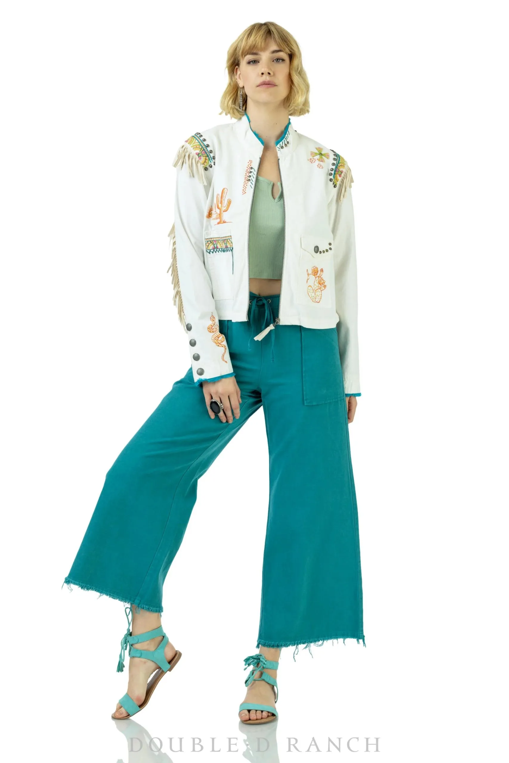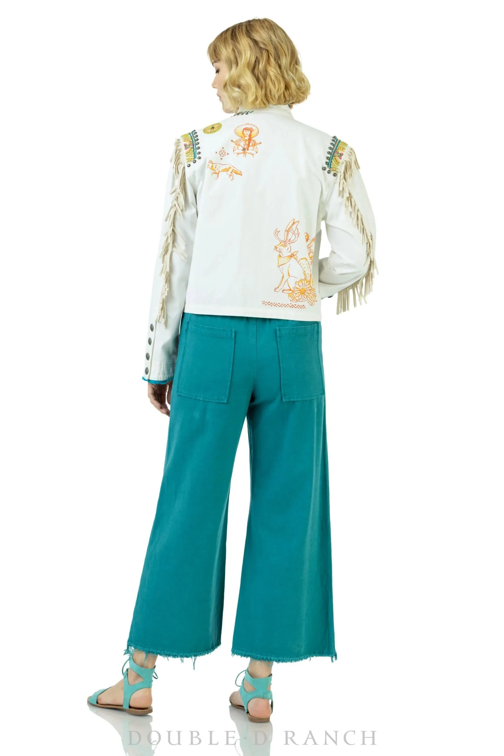 These colorful cotton jackets are chock full of southwestern style! They’re embellished with outlined images of some of the charming characters from the collection, complemented by some awesome embroidery and ornate epaulettes, finished with raw hem collar and cuffs and everyone’s favorite – fringe!
