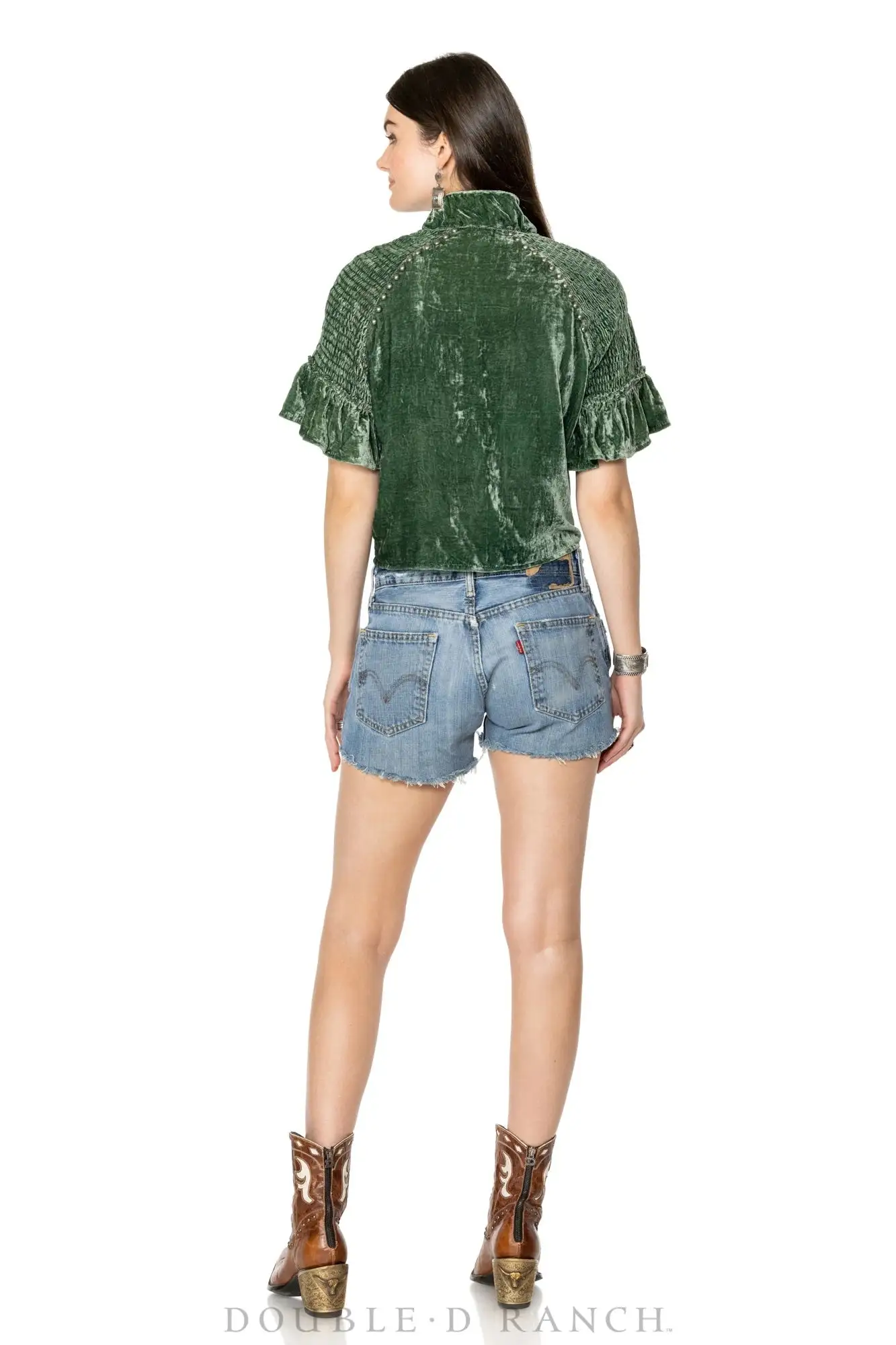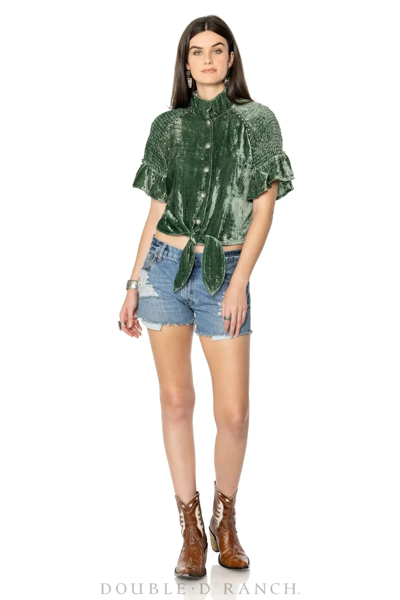 This flirty tie-front top is a luxe velvet with smocked shoulder and romantic ruffled sleeves, finished with a short standup collar, custom concho buttons, and subtle stud details. We love it paired with everything from classic cutoffs to the colorful Tack Room Blanket Pant.