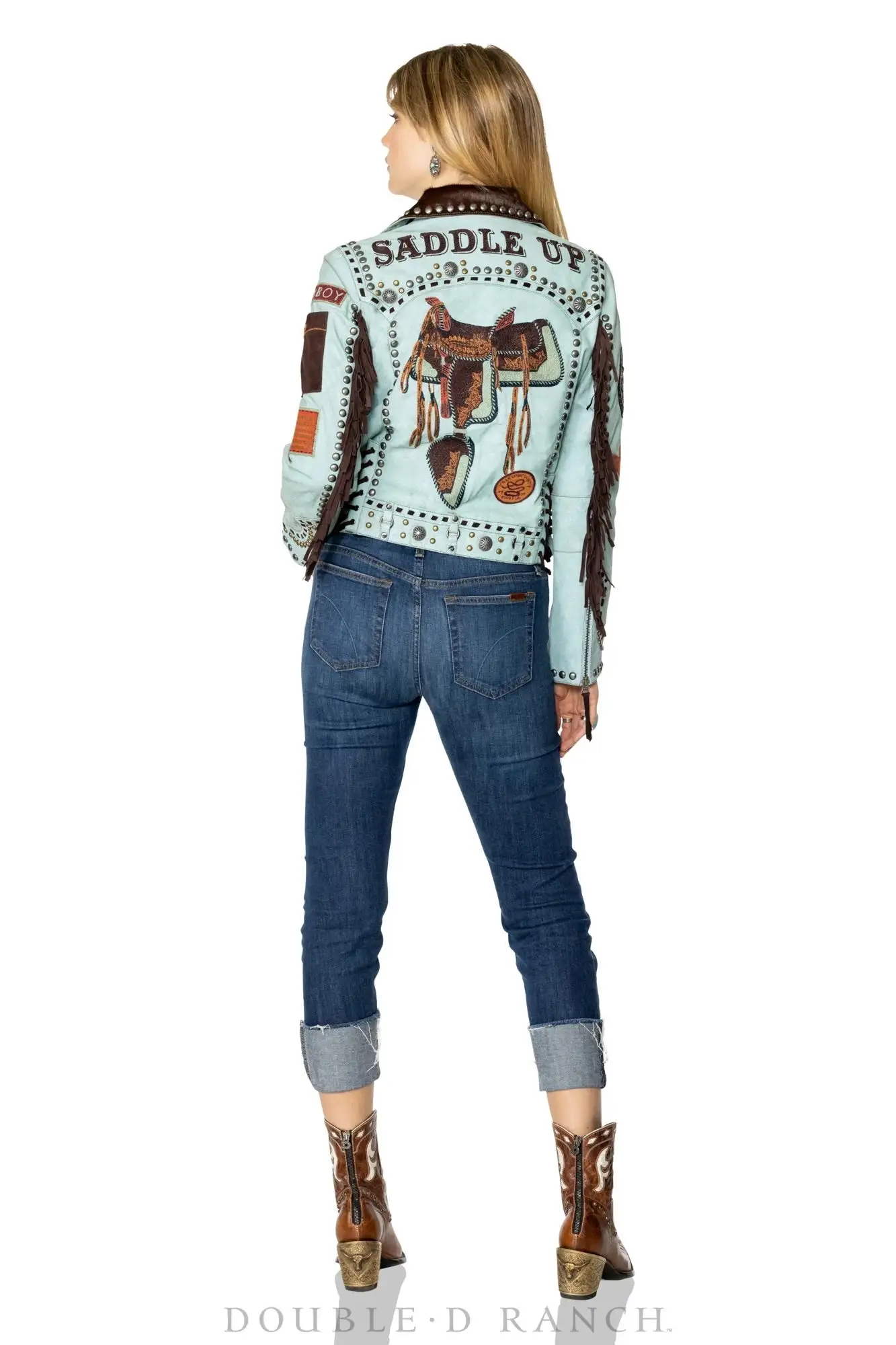 This season’s signature biker jacket has it all. The supple leather is a soft turquoise shade accented by the bold browns and hints of saturated oranges that permeate Wild Horses, heavily embellished with applique accents and big, bold embroidery of a saddle on the back. It’s finished with strong stud work, leather lacing, and of course a little fringe! Great color and character- this one’s a collector!