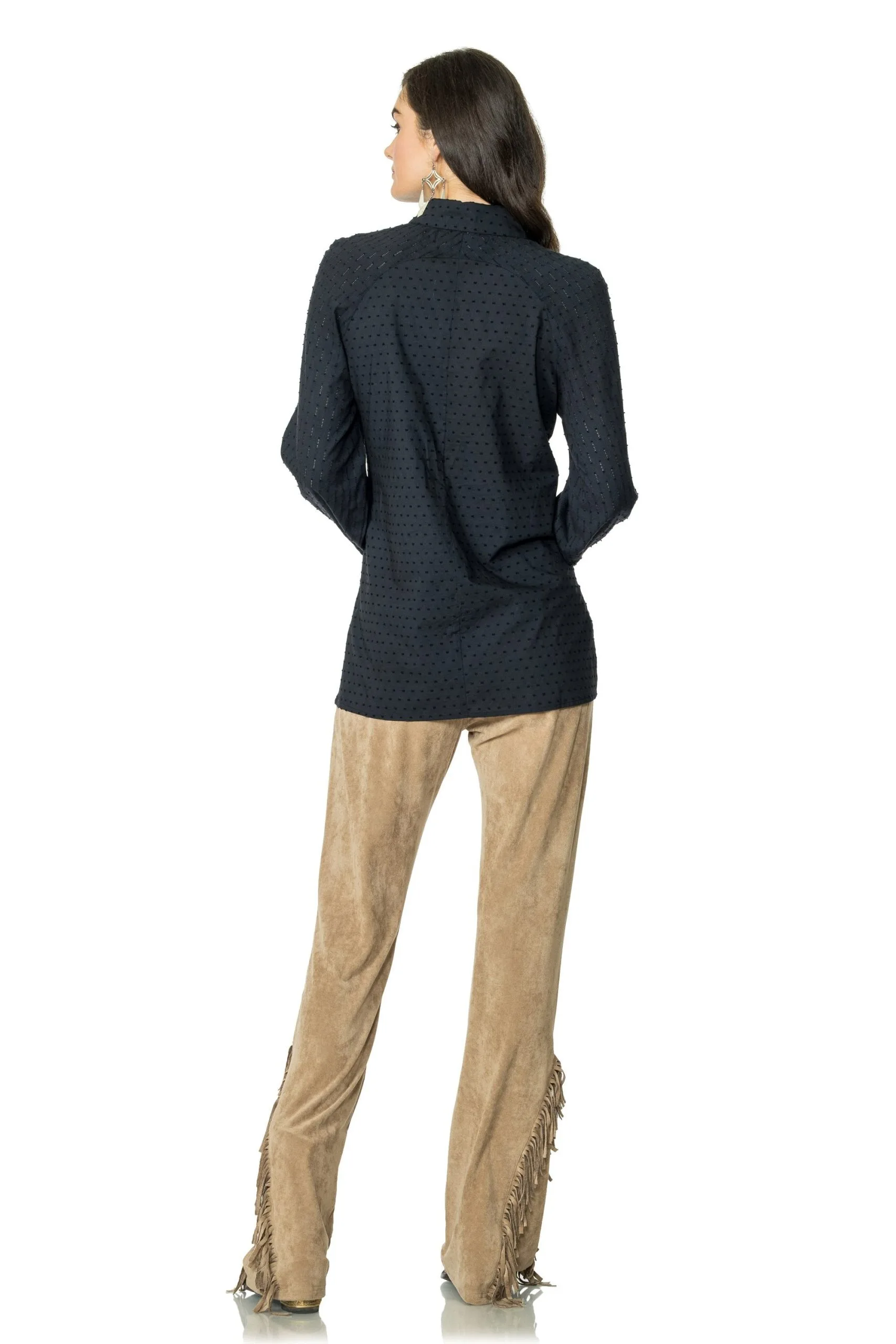 This textured cotton button-down is impossible to ignore with its vibrant southwestern embroidery flanking the front placket, finished with custom DDR concho buttons. We cannot overstate how beautiful this top is – we’re going to be rocking it non-stop!