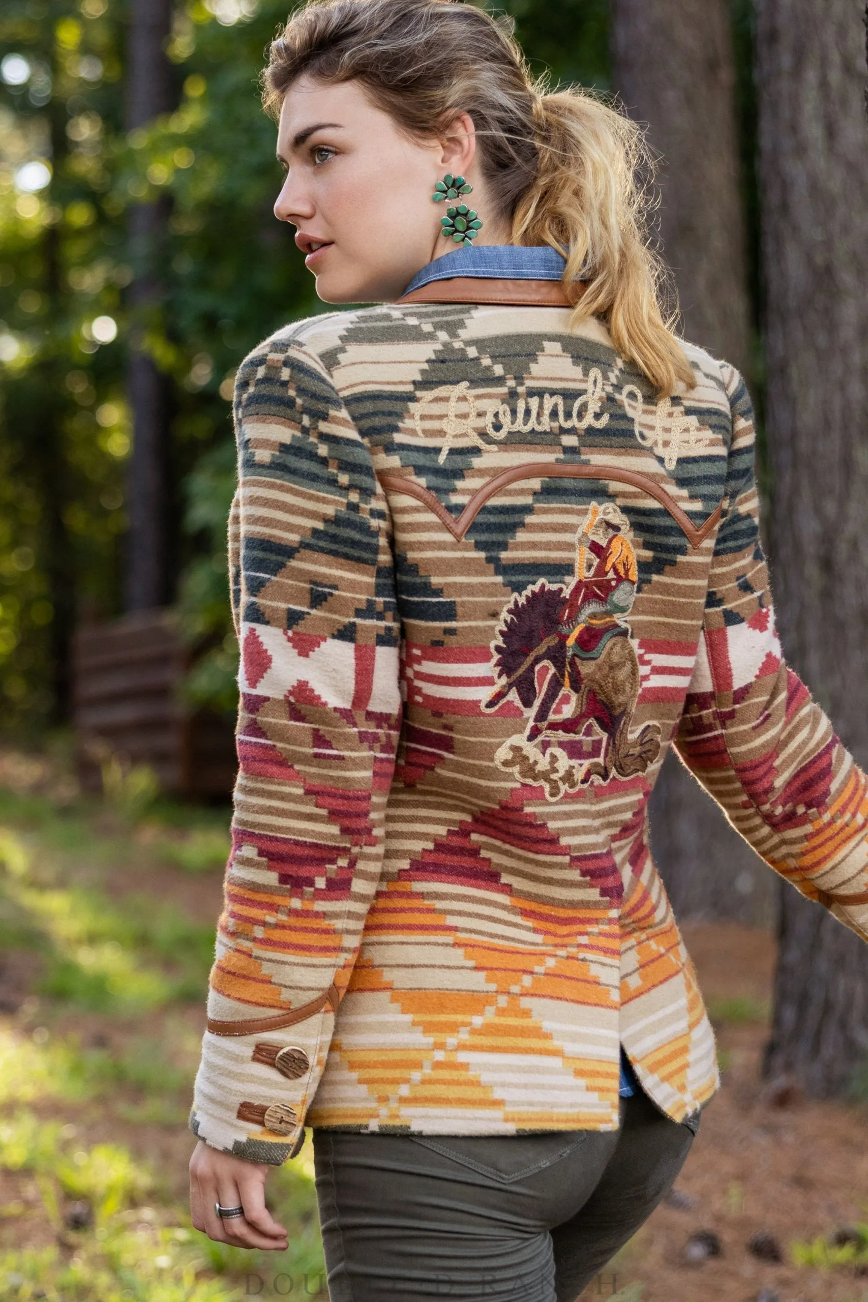 A throwback to the thing that first got us started, this Yellowstone Camp Blanket Jacket is made in the collection’s custom serape print designed exclusively for DDR, incorporating all the sunset and outdoor shades that inspired the Yellowstone collection. It’s a classic silhouette that hits at the hip with a peak lapel and a faux-leather collar, and it has awesome hand-embroidery on the back of a buckin’ bronc and “Round Up” in script. Absolutely fabulous fall jacket, the kind of head-turner that will have strangers begging to know where you got it.