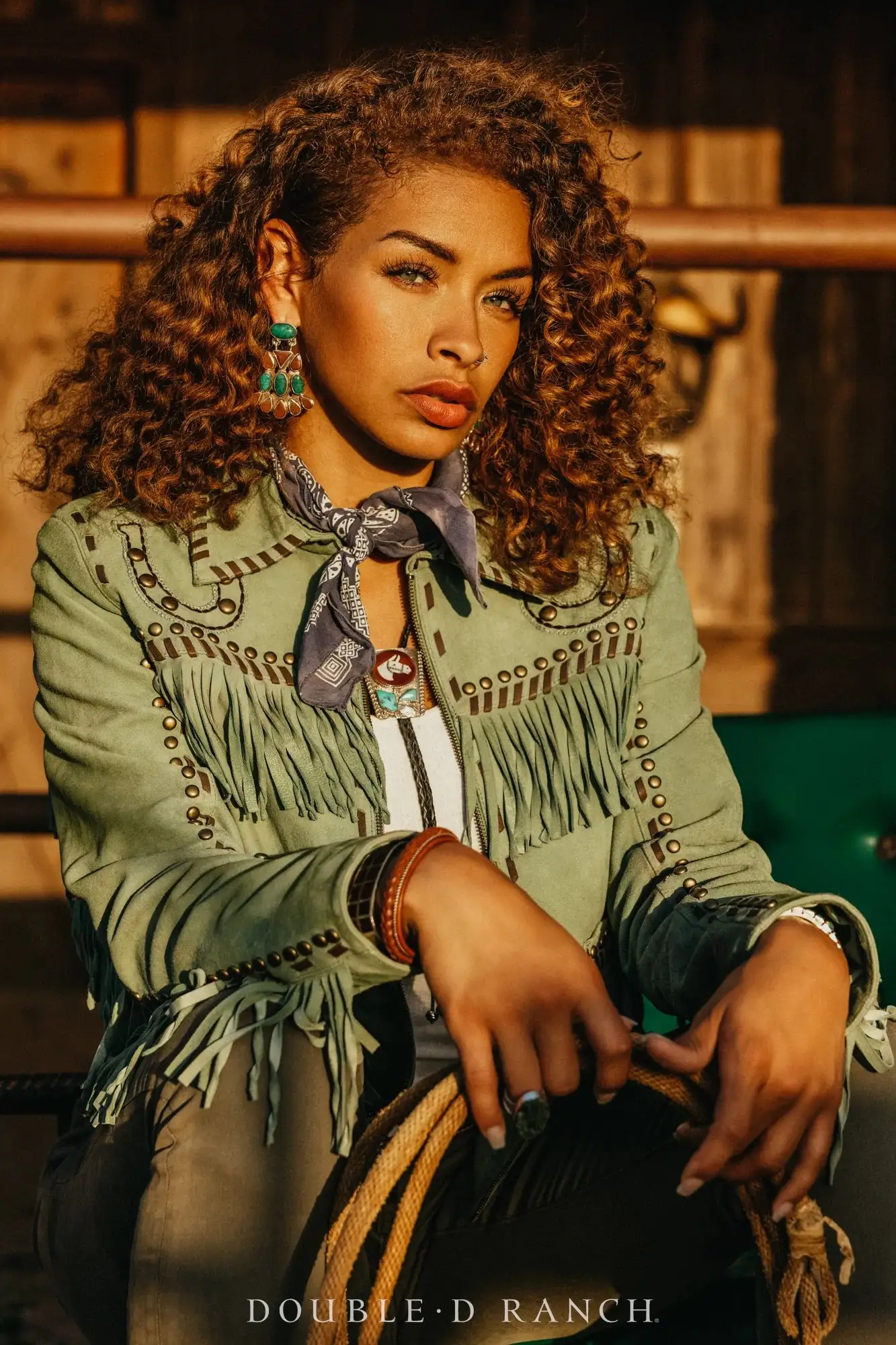 This gorgeous goat suede jacket is doubling down on all the embellishing elements that you know and love from DDR – contrast leather lacing, tonal twisted fringe, chic studwork, and of course, hand-embroidery of a pair of upright horseshoes to catch the luck!