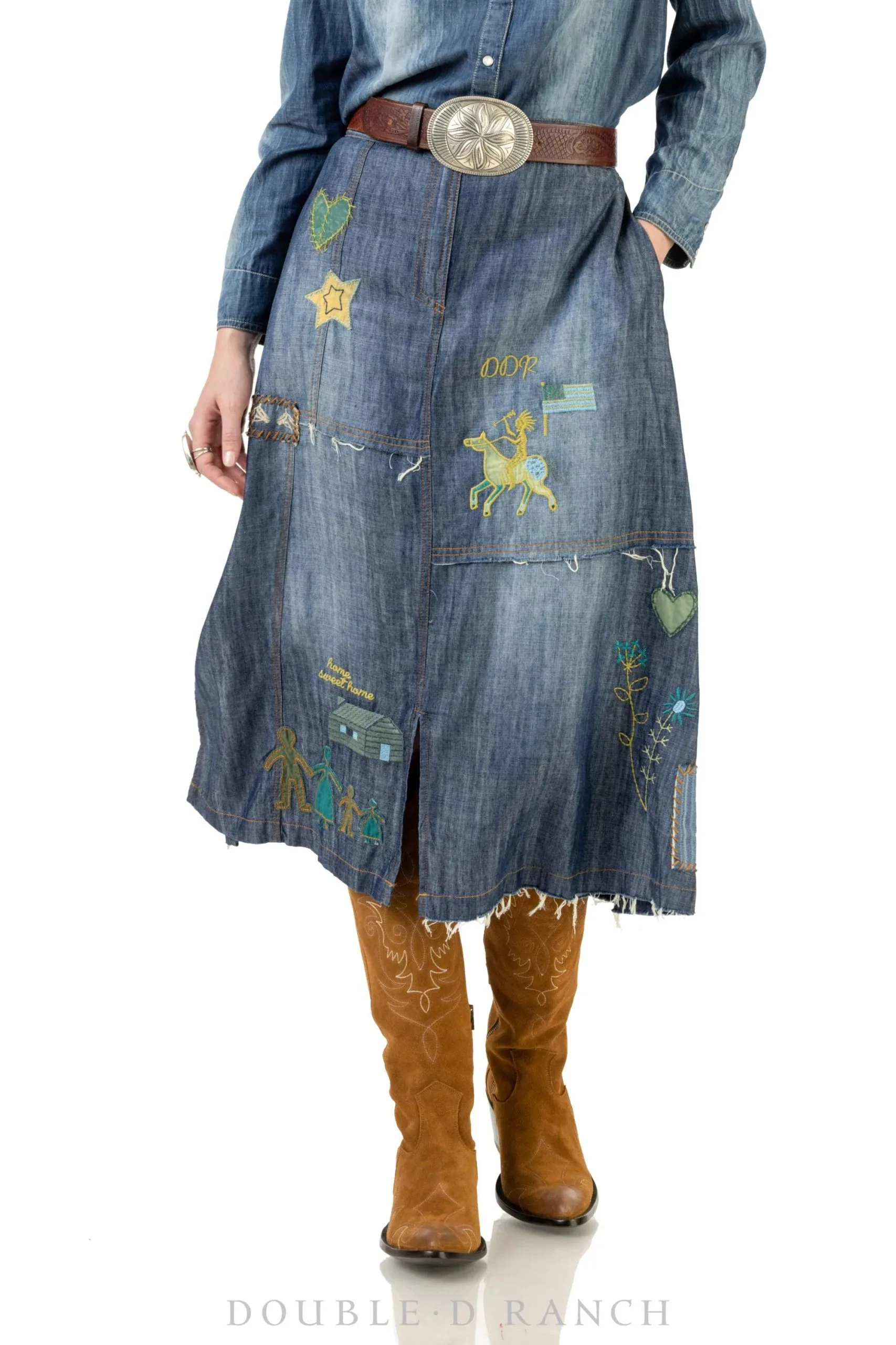 One of the most lasting lessons Little Mary imparted was teaching Cheryl to sew and embroider. This darling denim skirt is a nod to that ever-important life skill that eventually evolved into Double D Ranch. The midi-length skirt features rough-out edges, mock-mending, and some precious primitive embroidery.