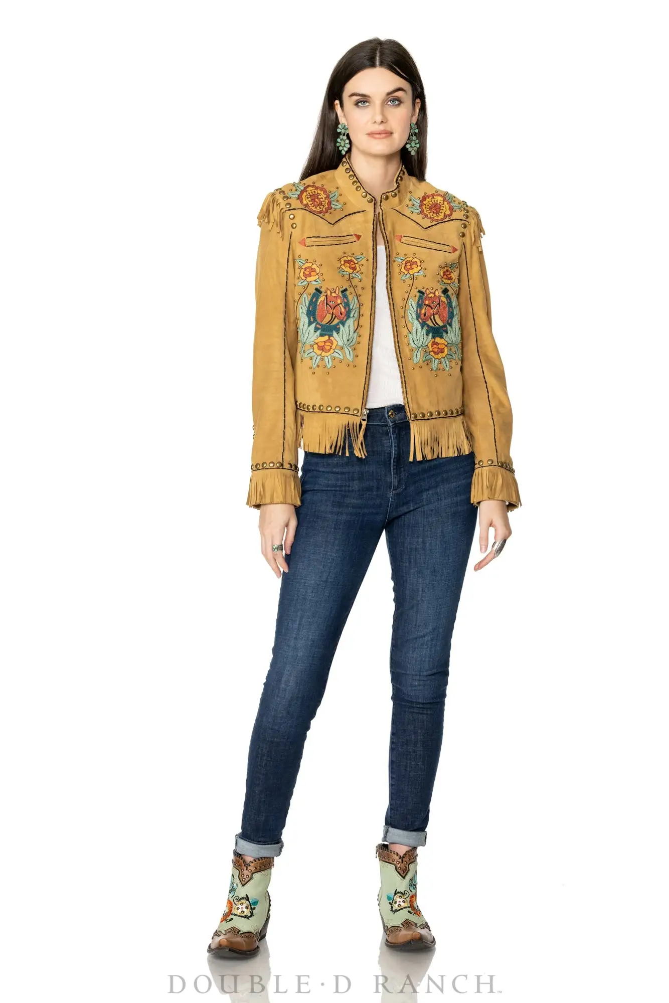 This stunning statement jacket is good looking and good luck! (Probably.) The gorgeous goat suede is embellished with intricate hand-embroidery of florals, horses, and horseshoes — turned upward to catch the luck, of course. The motif is accented by western welts and metal stud details and finished with every cowgirl’s favorite feature: fringe!