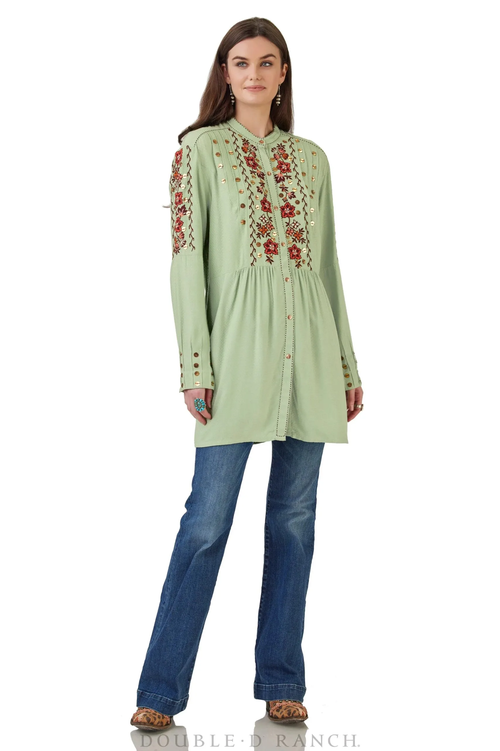 Possibly even a dress if you’re petite. The Red Rock Top is as versatile as it is beautiful! The soft green button-down is embellished with intricate hand-embroidered florals and a subtle shimmer in the beadwork. Lovely over leggings, skinnies, or open over a simple cami and jeans!