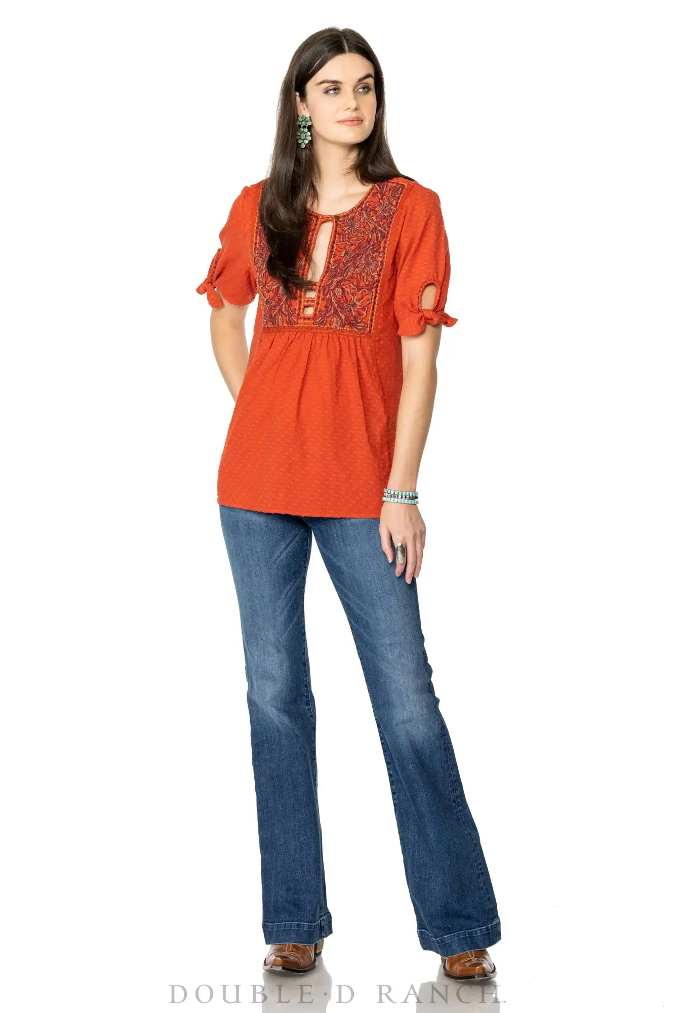 (…well, if you opt for it. You can always throw a cami or bandeau under it for a more demure, layered look.) This flirty, flowy top is a textured cotton embellished with intricate floral embroidery in a sweet silhouette with subtle gathering, keyhole tie sleeves, and a deep laddered-keyhole cutout in the front panel, and it’s finished with an elegant detail of tonal lace. Flattering, fabulous, and unforgettable.