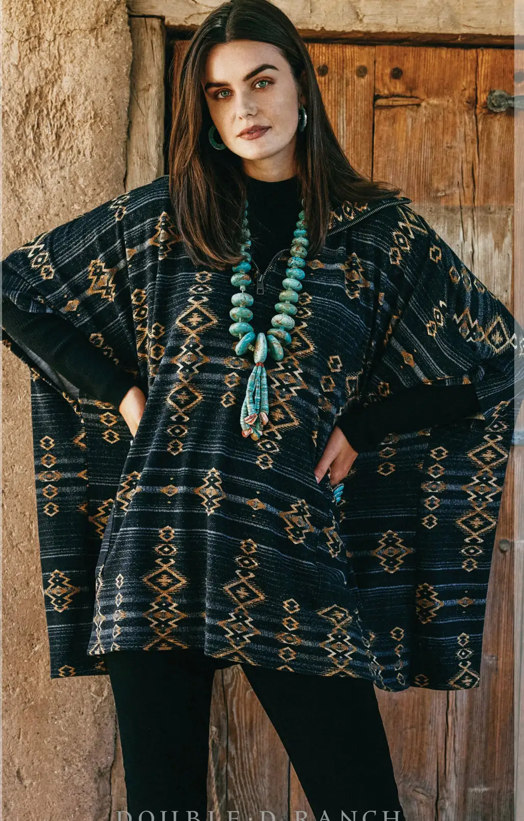 What we love about this print is that it’s a subtle nod to blanket pattern (one of our all-time faves), but it’s scaled down which actually gives it an upscale elegance. And those hues all working together is just rich. This beauty brings a casual-chic edge to your classic poncho silhouette with a zippered collar and patch front pockets. (And who doesn’t love some pockets!)