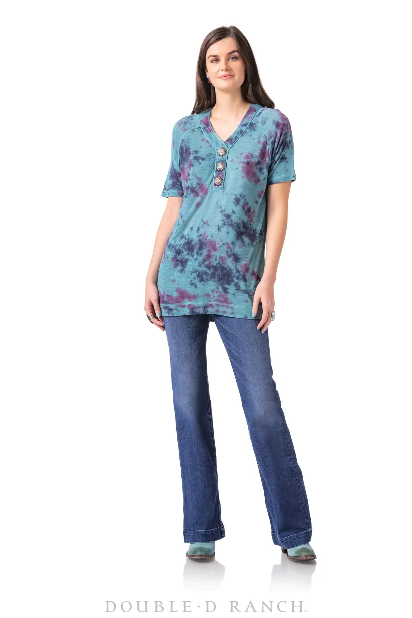 This colorful casual is a short-sleeved top with ALL the embellishments. The subtle tonal polka dot pattern is accented with lovely lavender floral embroidery, chic studding, and perhaps our favorite part, faux turquoise beading! It’s an easy-to-wear silhouette with dimensional detail – what more could you want?