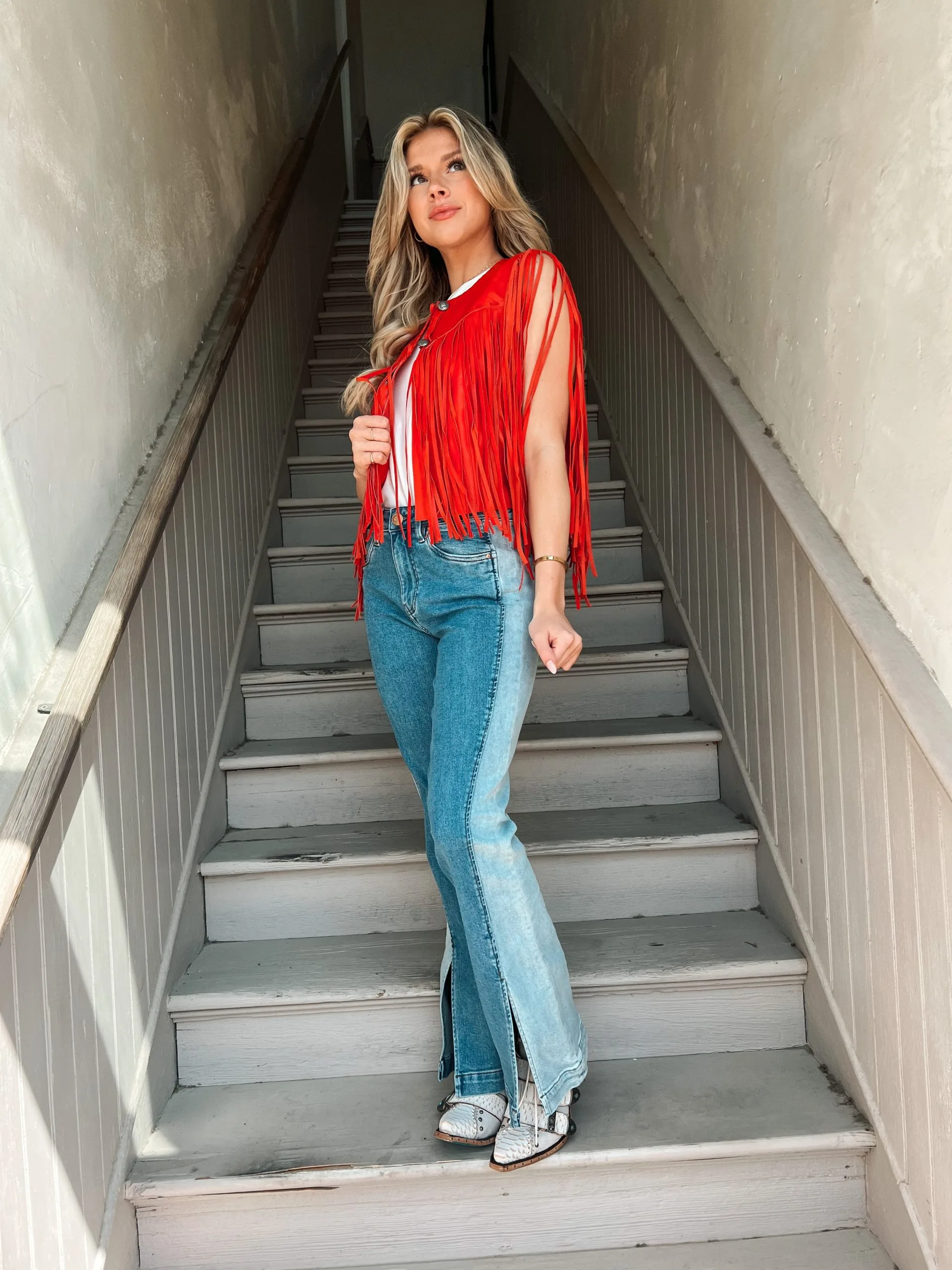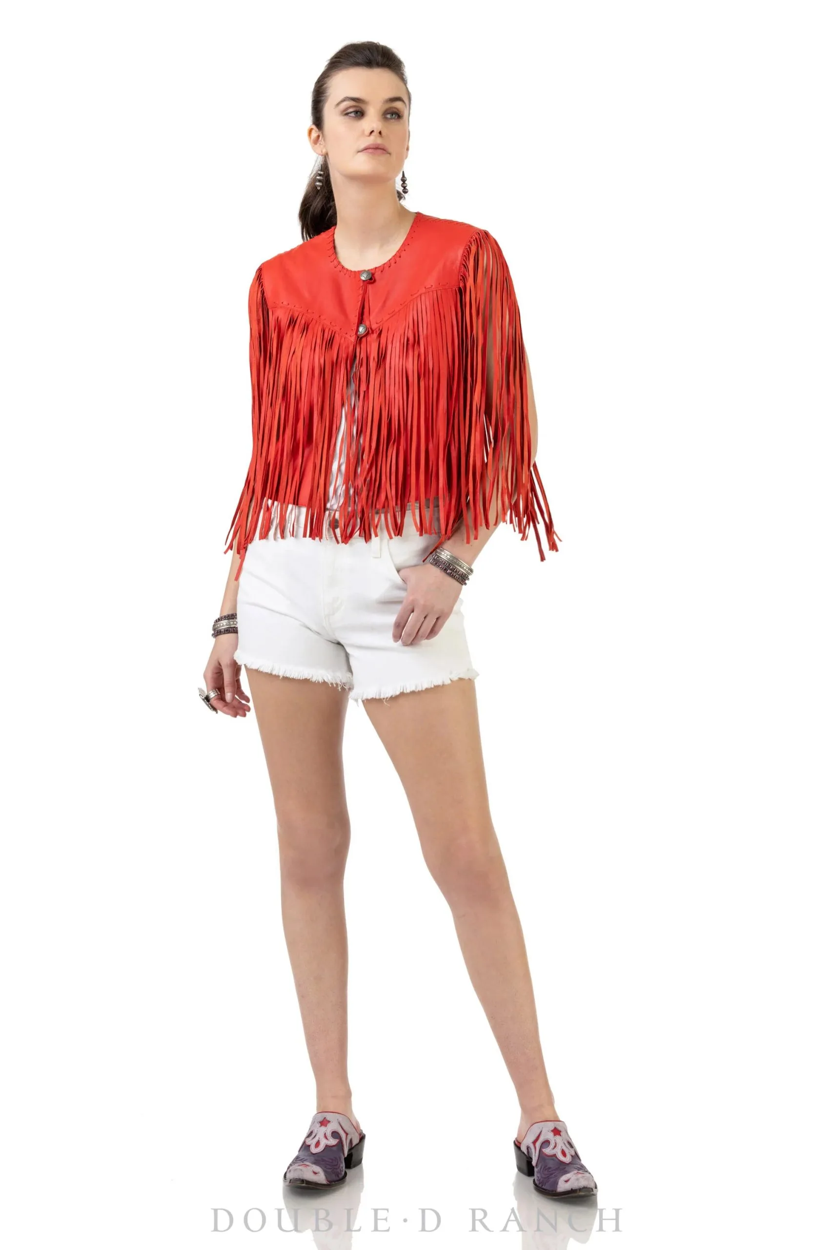 This sheepskin statement-maker is going to be one of this season’s must-haves! The straight-line vest silhouette features double concho buttons at the neck and tonal leather lacing details, but it’s the bold hues and full-length fringe that are going to have you turning heads and dropping jaws!