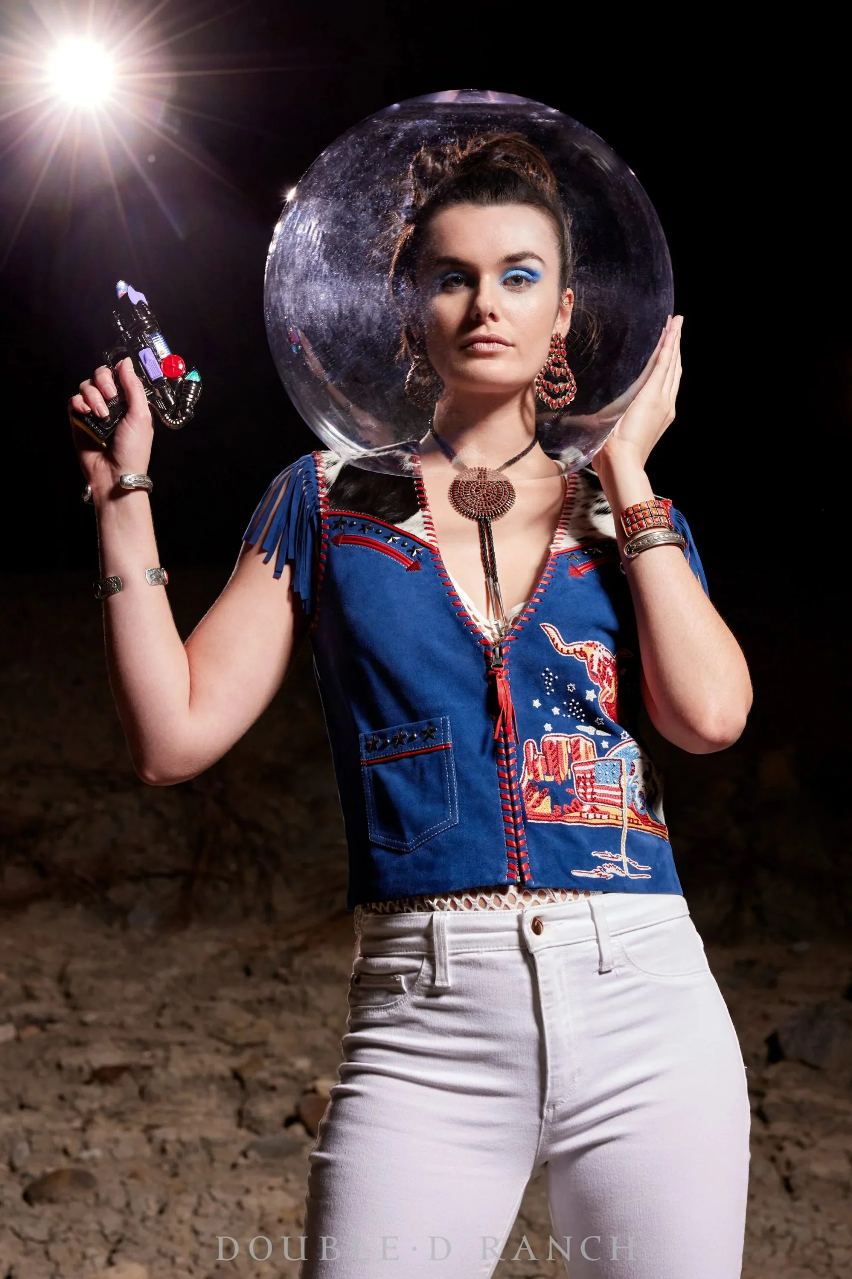Who doesnโt love a statement piece that tells a story? This chic suede vest packs a whole solar system worth of style into one cute, cropped silhouette! The rich royal blue suede is embellished with whimsical space scene of a lunar-leaping longhorn and some interstellar topography complete with the planted American flag. The tie-front vest has a hair-on hide yoke with contrast red leather piping and stitching accented by 5-point star studding and western welts, finished with some fun fringe at the shoulders.