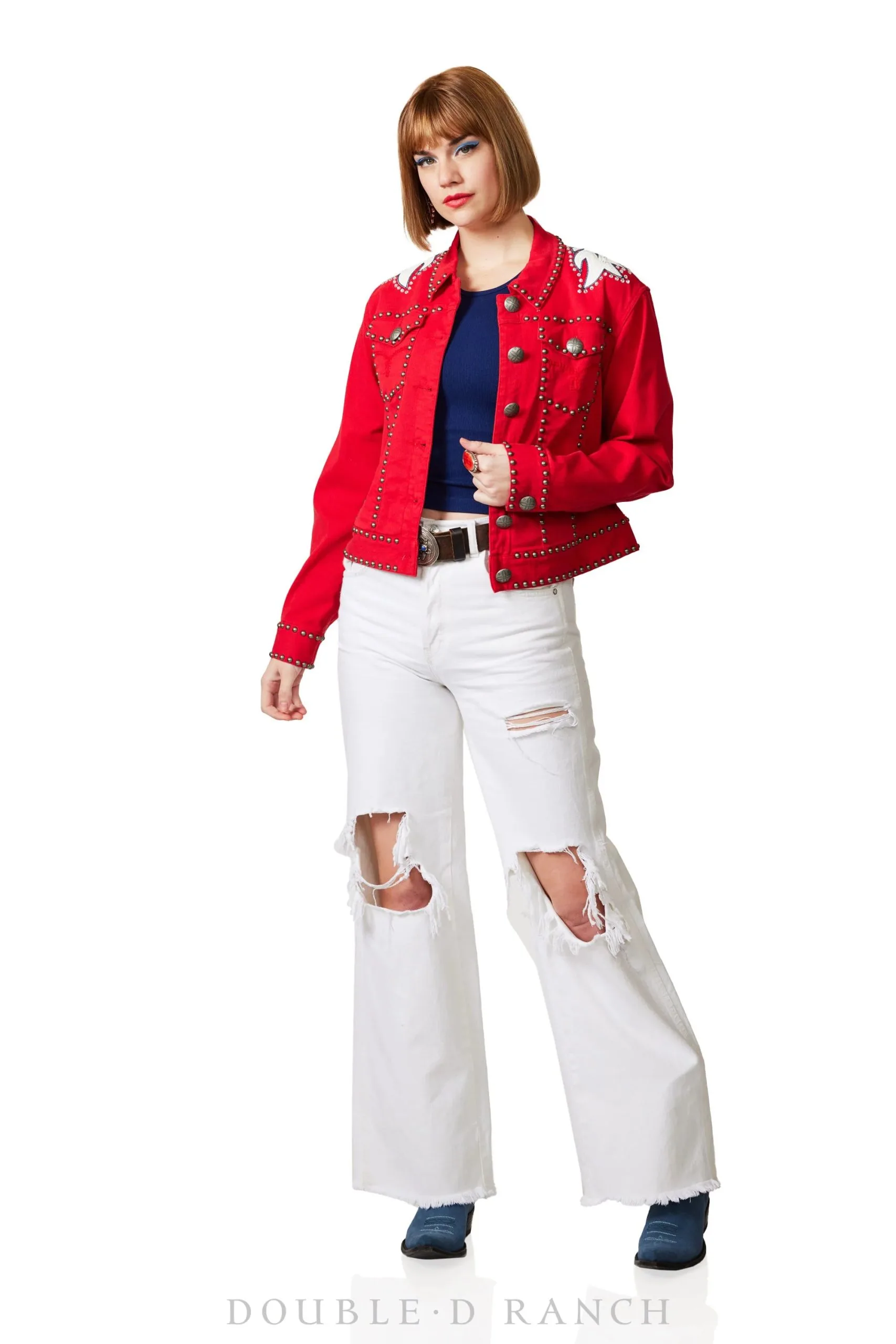 This bold beauty isn’t a jean jacket for your average earthling. The vibrant “rocket red” denim is eye-catching and impossible to ignore, embellished with heavy metallic studding and custom concho buttons, and the back brings outerspace sparkle with a retro-futuristic “To the West & Beyond” graphic accented with rhinestone details.