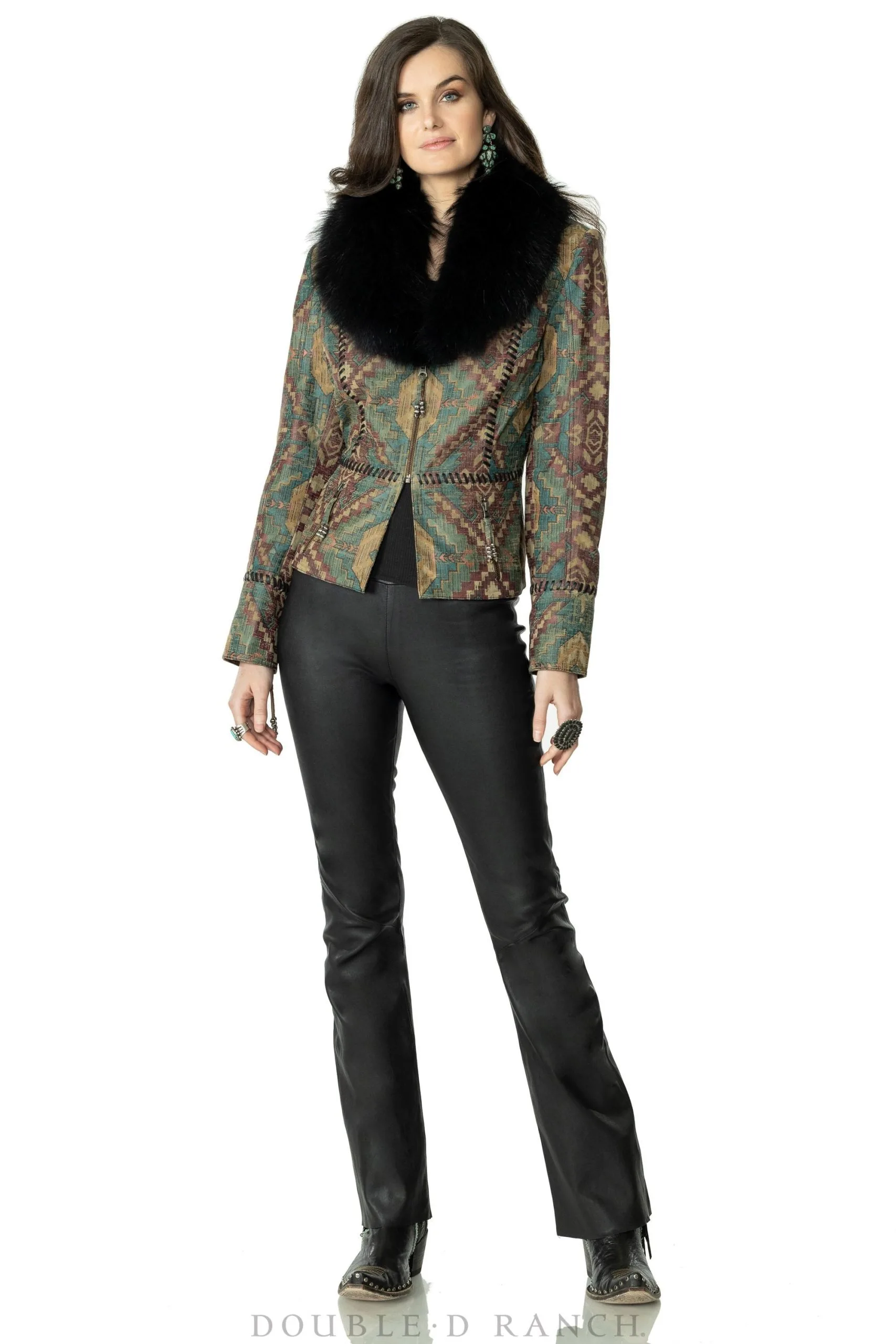 We’ve made a lot of gorgeous goat suede jackets in our day, but man, this one is really something special. The print in softened shades of olive and wine and gold give it an almost royal richness which is compounded and complemented by the voluminous luxe fur collar. Truly stunning, a jacket fit for a queen – or a cowgirl!