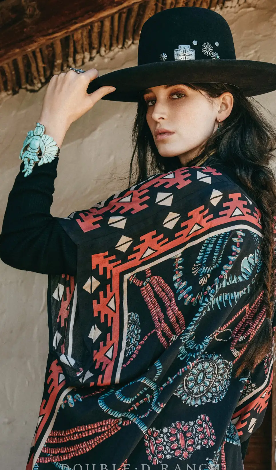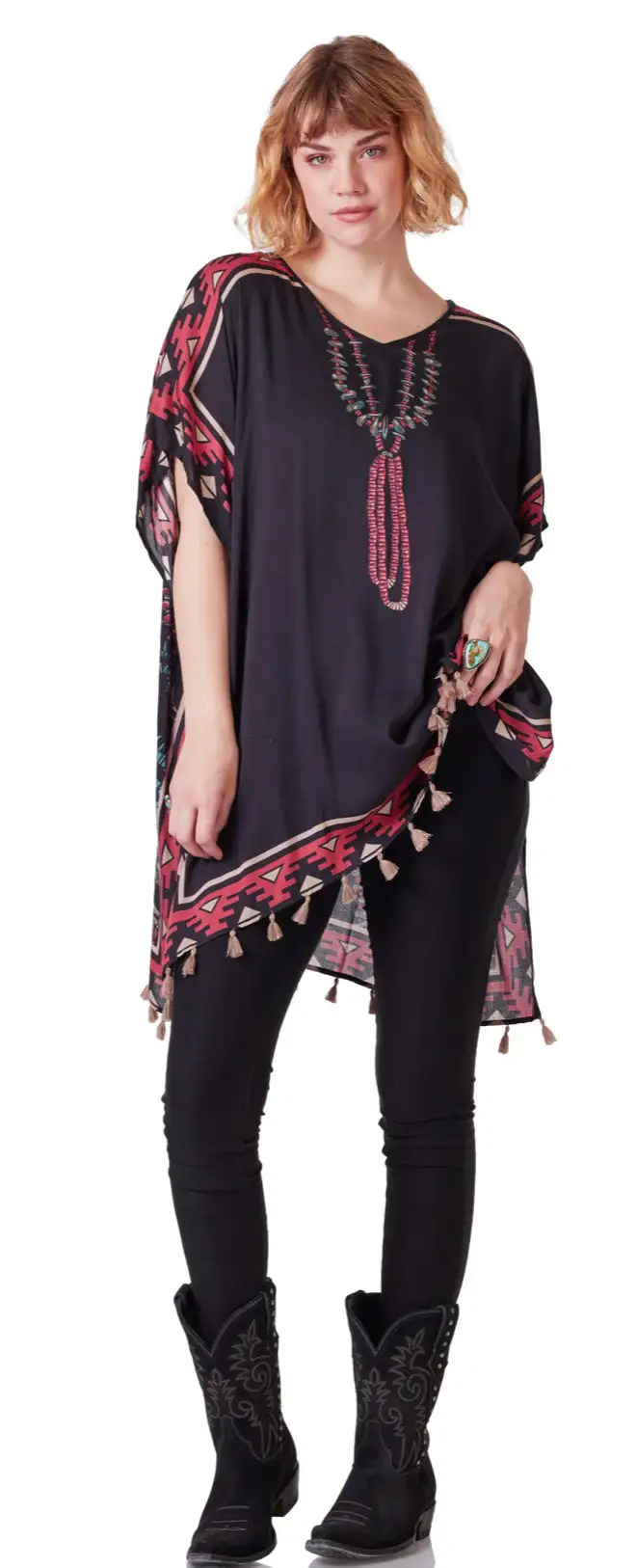 This print was inspired by trips from our childhood, when we would road trip to New Mexico and go into the markets and town squares and just be overwhelmed by all the astonishing artistry and craftsmanship. We brought it to life in this classic cut poncho, bordered with geometric blanket patterning and hemmed with tiny tassels. A year-round winner!