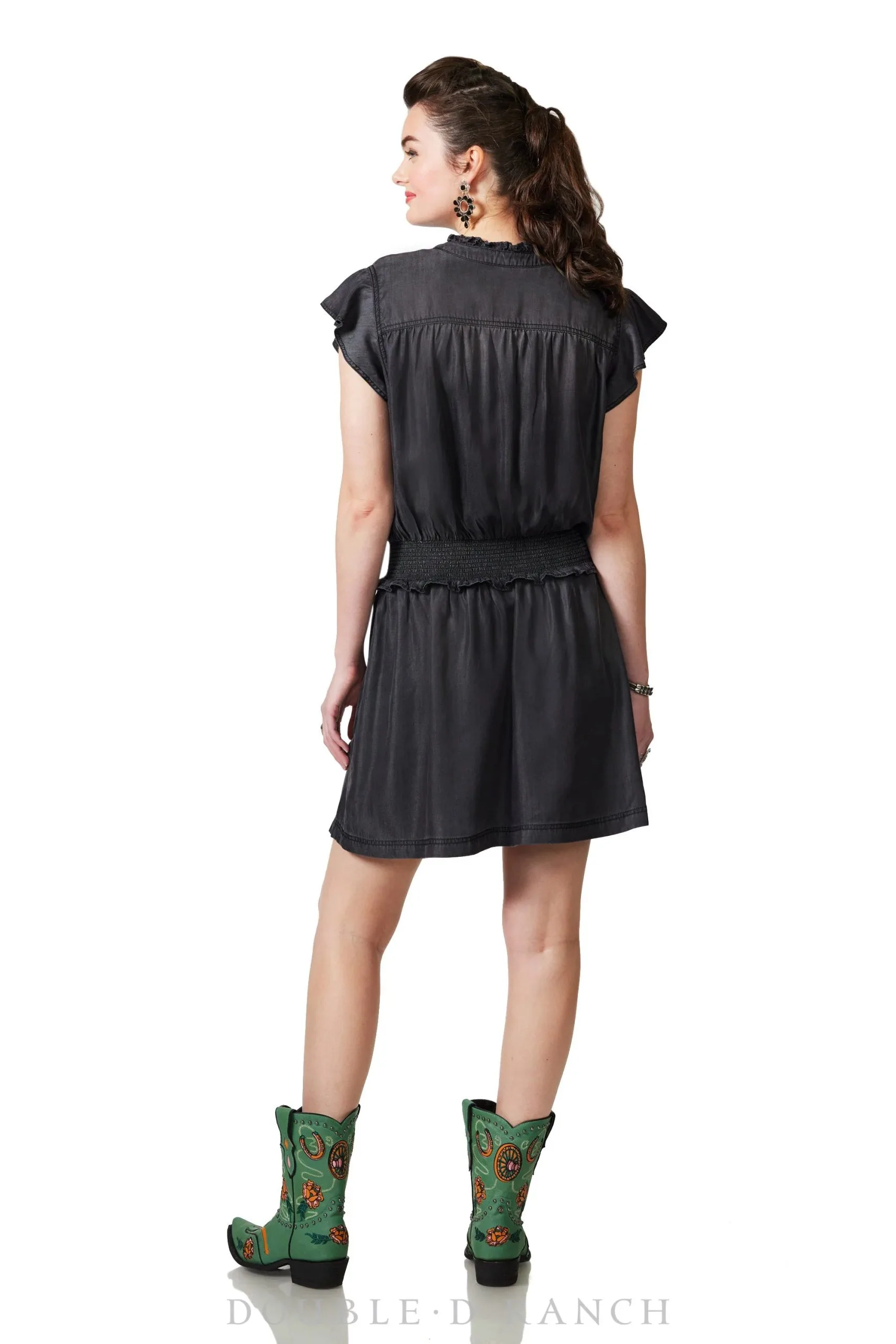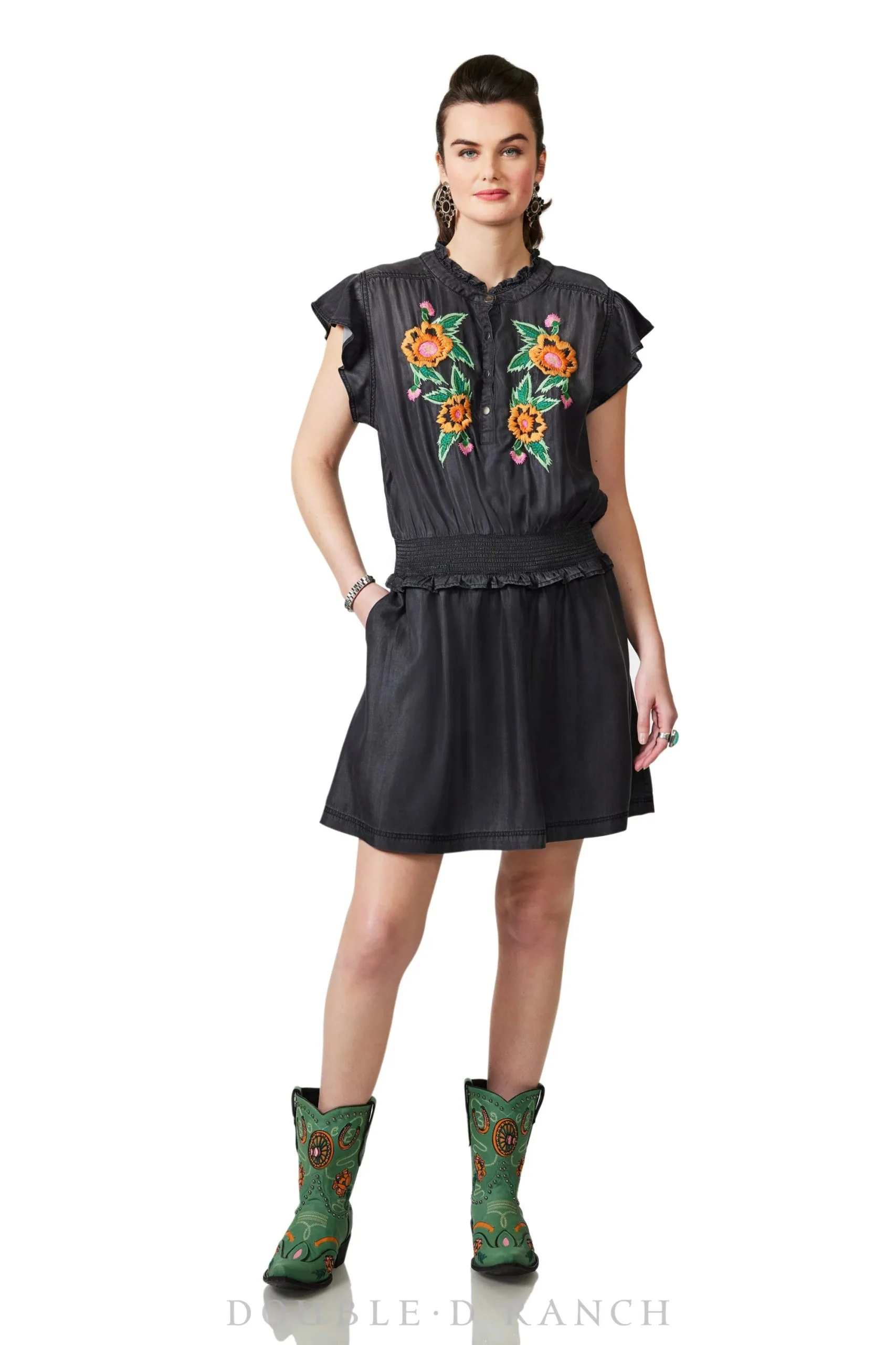 Denim tencel is summer’s super-fabric and it’s a dream in this dress. The chic black is a perfect canvas to make the bold floral embroidery *pop* and the dainy details of ruffle and smocking adds fun femininity. Oh yeah – and POCKETS!