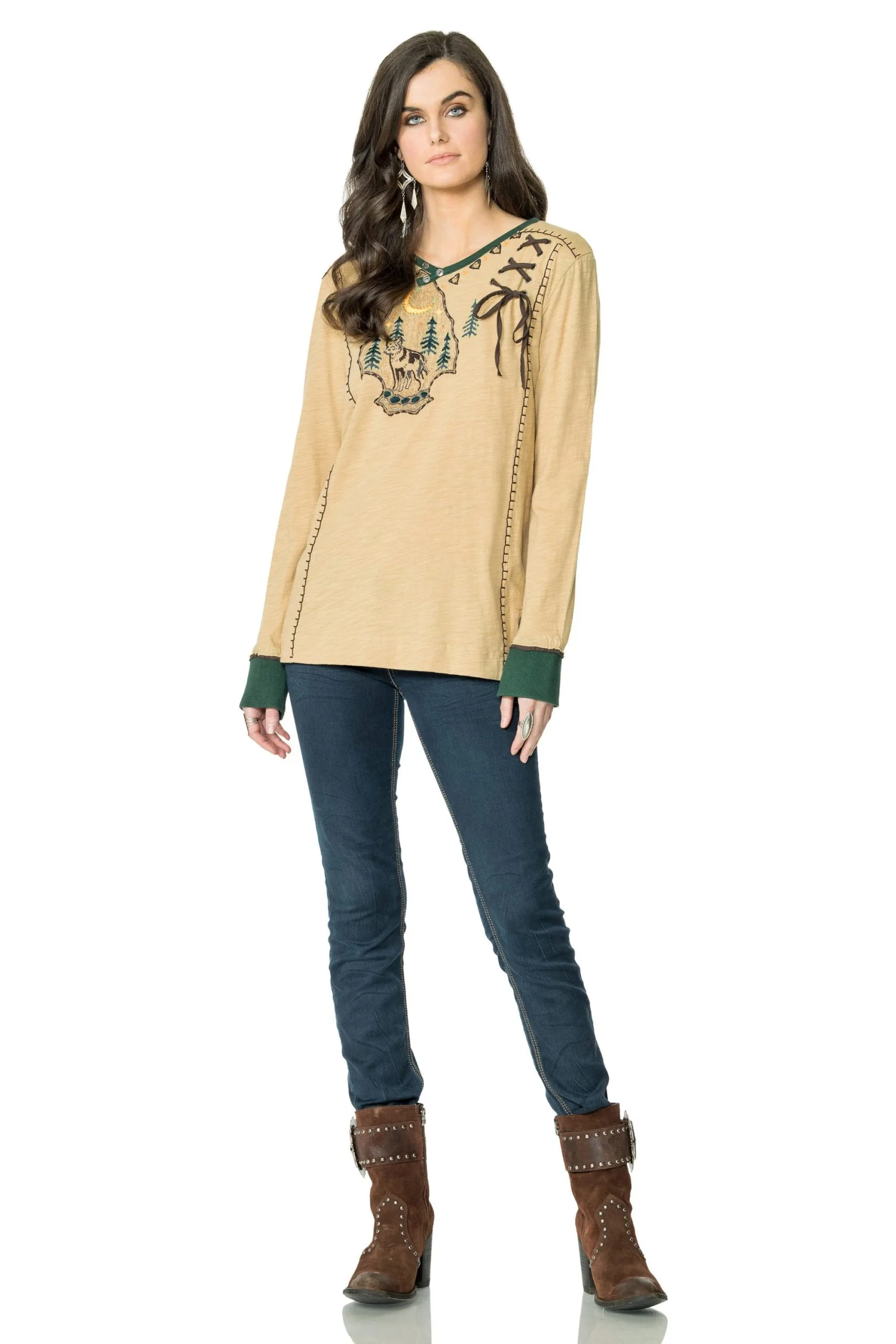 So we dedicated this shirt to y’all. It’s a striking, soft cotton tee that’s adorned with an arrowhead, forest, and wolf motif, embellished with embroidery, contrast stitching, and lacing. It has a contrasting collar and cuff, and dainty decorative buttons. It’s an upgrade to your everyday outfit and will be one of those pieces that always serve as a subtle reminder of this awesome sisterhood – if you know, you know.