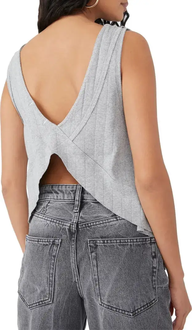 Lovely as a layer or simply styled solo, this essential tank is featured in a staple, V-neck silhouette with defined bottom hem and open back at bottom for added shape.