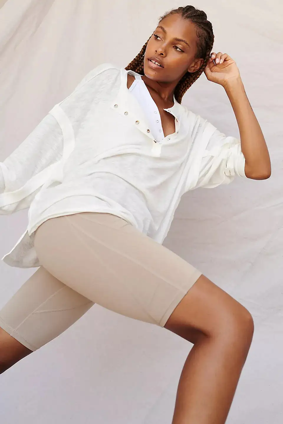 Perfect for layering over your workout clothes (or just wearing all the time) this so essential long-sleeve is featured in a henley style with a button-up neckline and an oversized, slouchy fit.