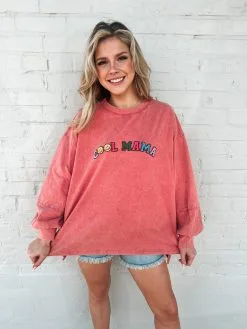 Washed brick red tee with beaded cool mama detailing! This tee is a relaxed fit!