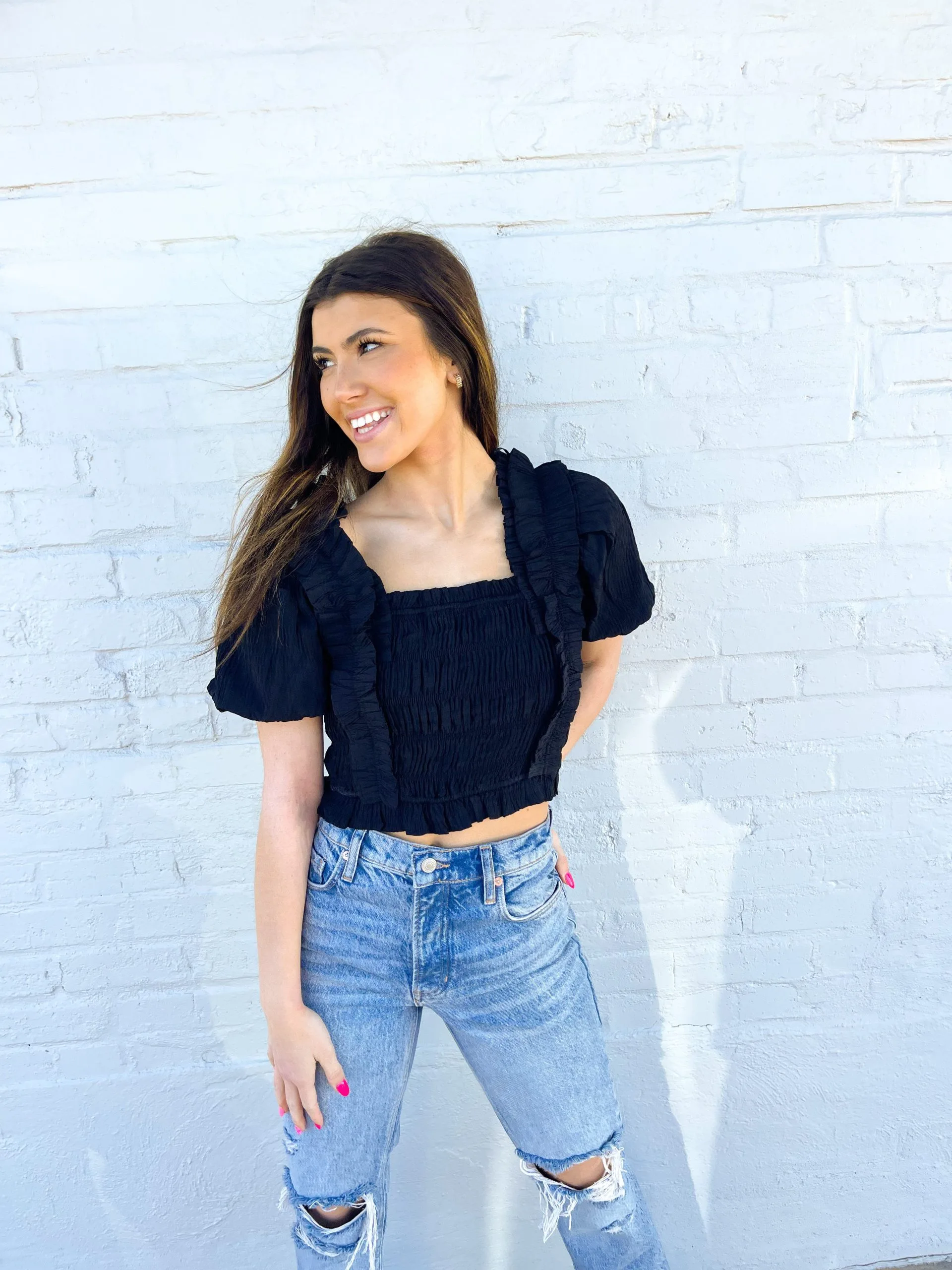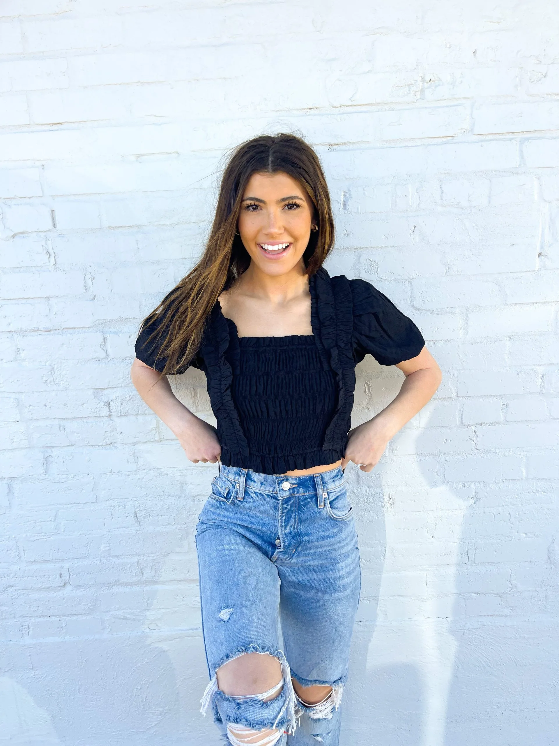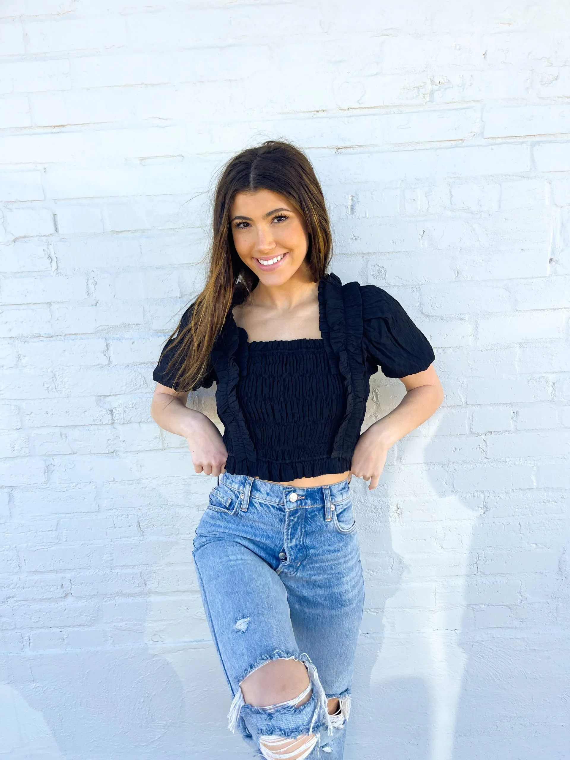 The Oakland top features a smocked body with ruffle detail across the shoulder and statement poof sleeves!