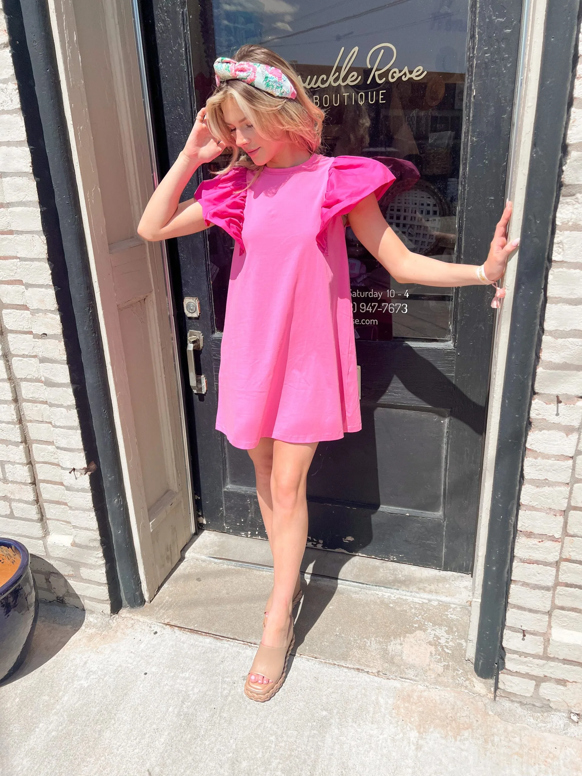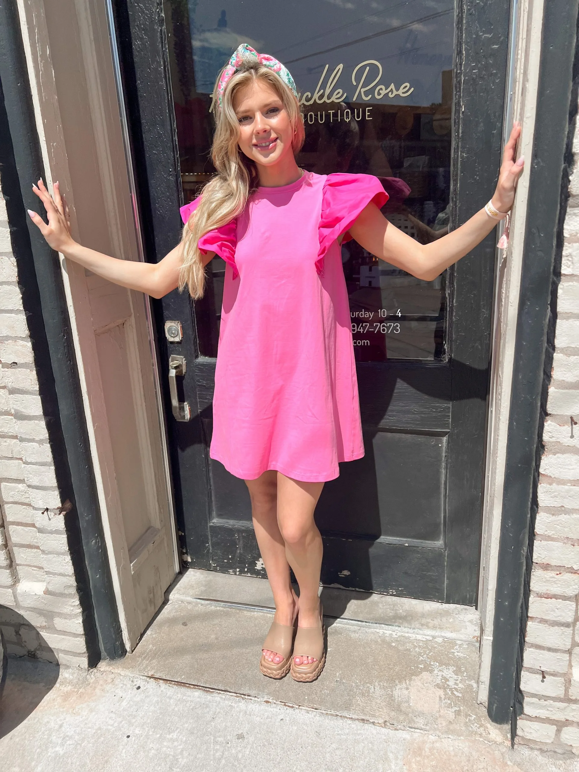 This T shirt dress is picture perfect when it comes to cute meets comfy! Comfy T shirt material mini dress with ruffle sleeve detail!