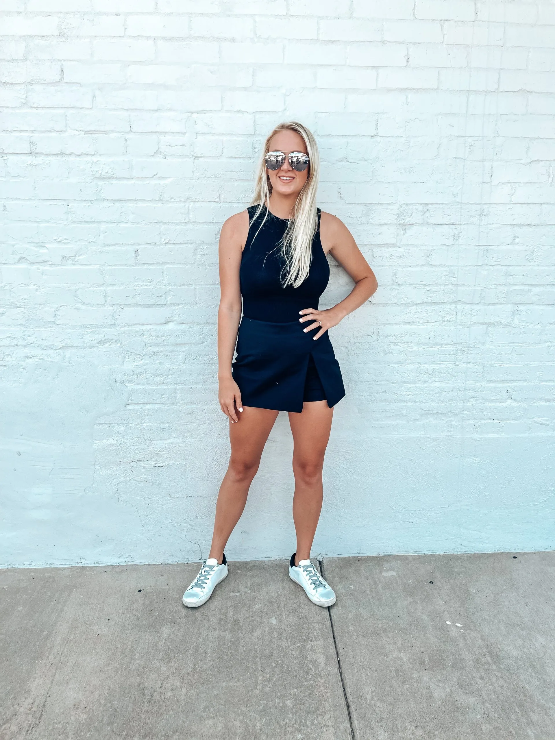 This black pleated skort is the perfect combintaion of work and play! Enevenlope detail in the front with shorts inthe back!