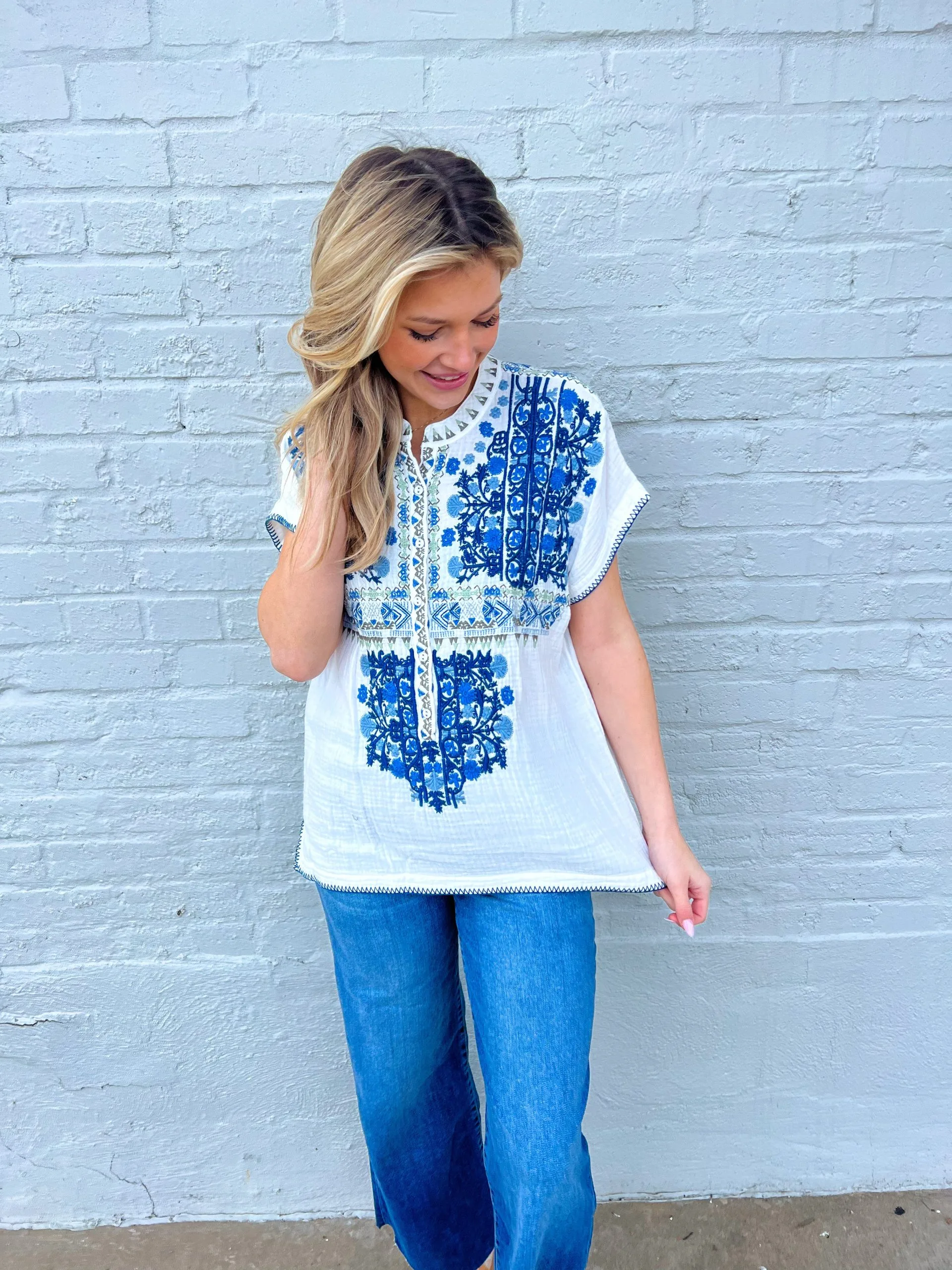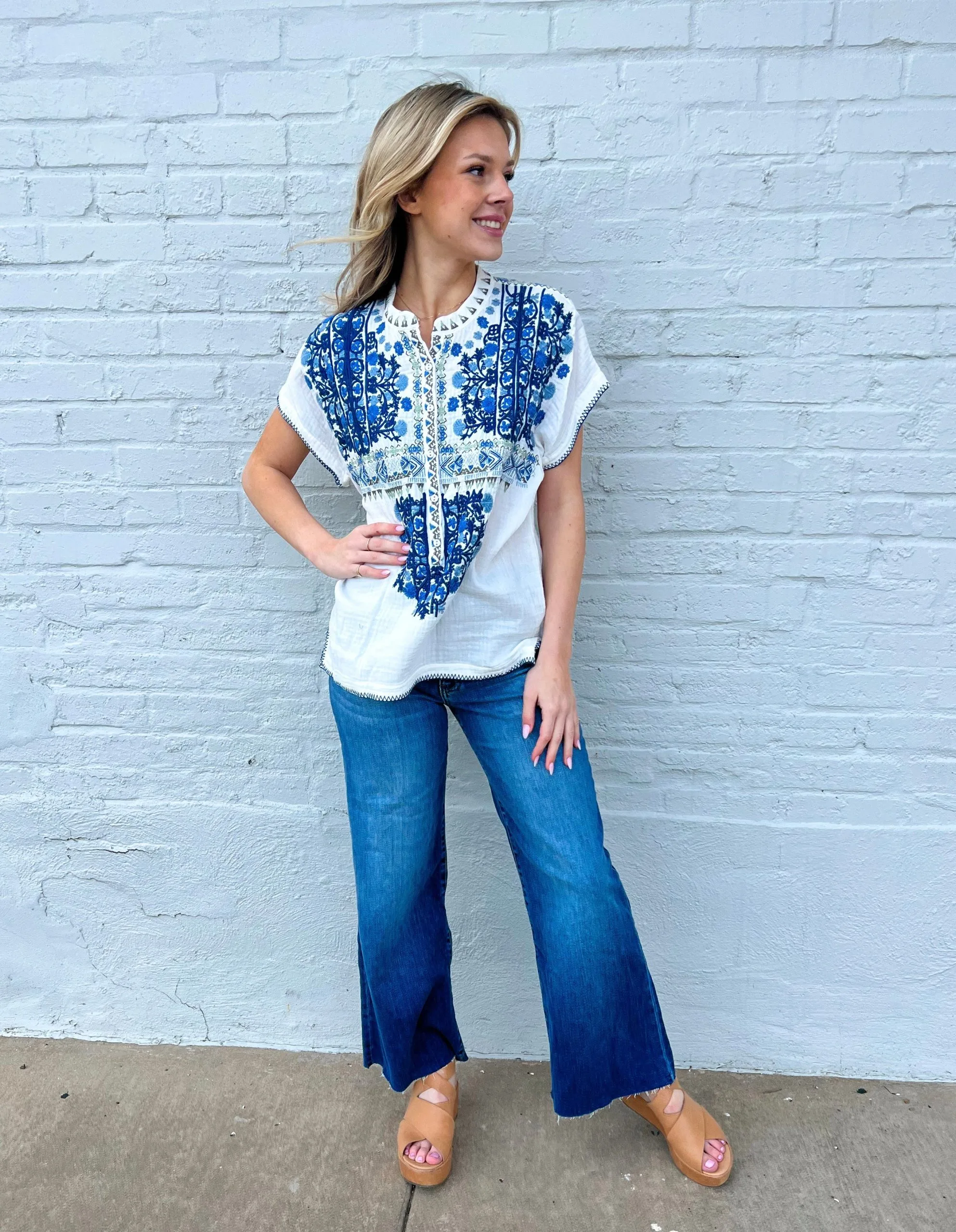 Tinged with a bohemian feel, the Atanase Blouse is a versatile addition to every wardrobe. This cotton blouse is cut in a slight relaxed fit and boasts a round neck, a button closure, short sleeves, and an intricate placement embroidery in subtle blue hues. Style with linen pants for a relaxed approach to warm-weather dressing. Product Details: • 100% Cotton • Placement Embroidery • Fabric Covered Buttons • Split Hem • Model Height: 5’11” • Model is wearing a size Small • Measurements for Size Medium: Length- 26 1/2″, Bust- 48″