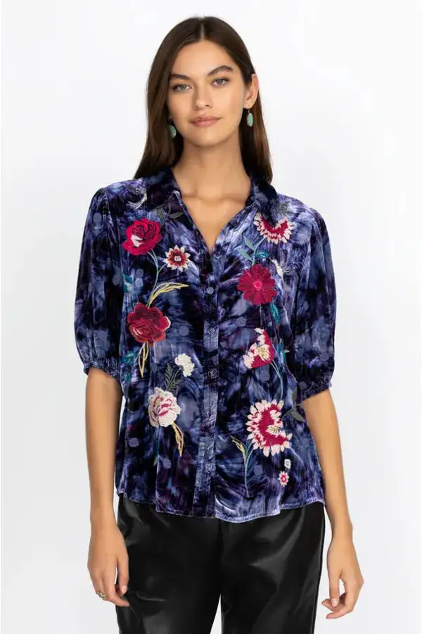 - Johnny Was “Junia Lisbon” velvet shirt with floral embroidery