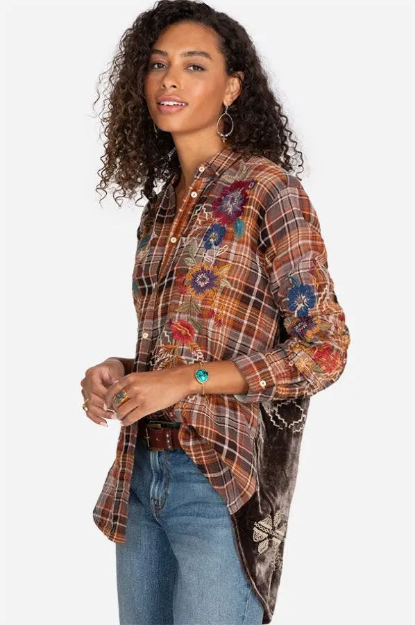 A chic take on a classic cut, our Olivia Velvet Back Oversized Shirt features joyfully stitched embroidered details. This timeless button-down combines convenient utility with cozy style, and can easily be dressed up or down. Pair with your favorite denim or leggings for a laid-back, autumn-inspired look. Add your favorite hat and silk scarf to complete the ensemble.