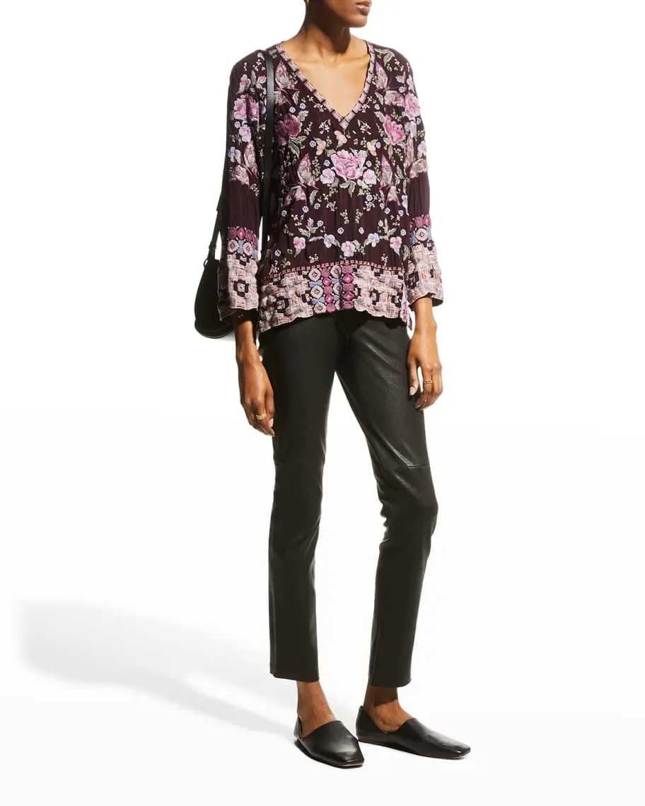 - Johnny Was “Terraine” blouse in floral-embroidered georgette