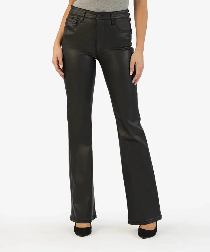 - Easy to style up or down, these dramatic jeans feature full-length flared legs, a leather-like matte coating and Fab Ab shaping pockets that flatten and smooth.