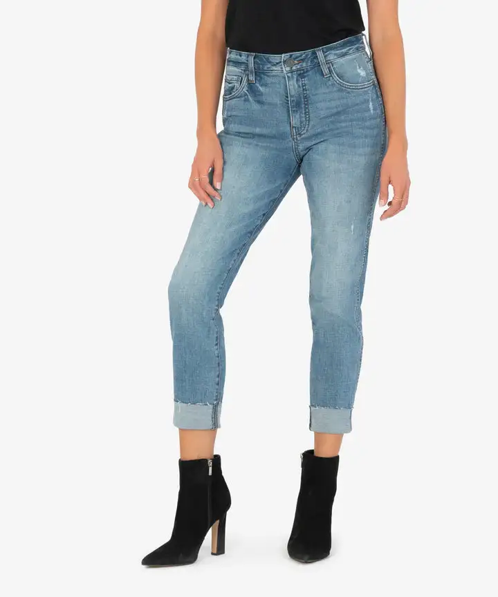 - Designed with front pocket technique that is flattening, slenderizing and provides comfort to every wear. The classic blue wash and slight destruction makes these a closet staple! The wide-cuff hem is adjustable and versatile.