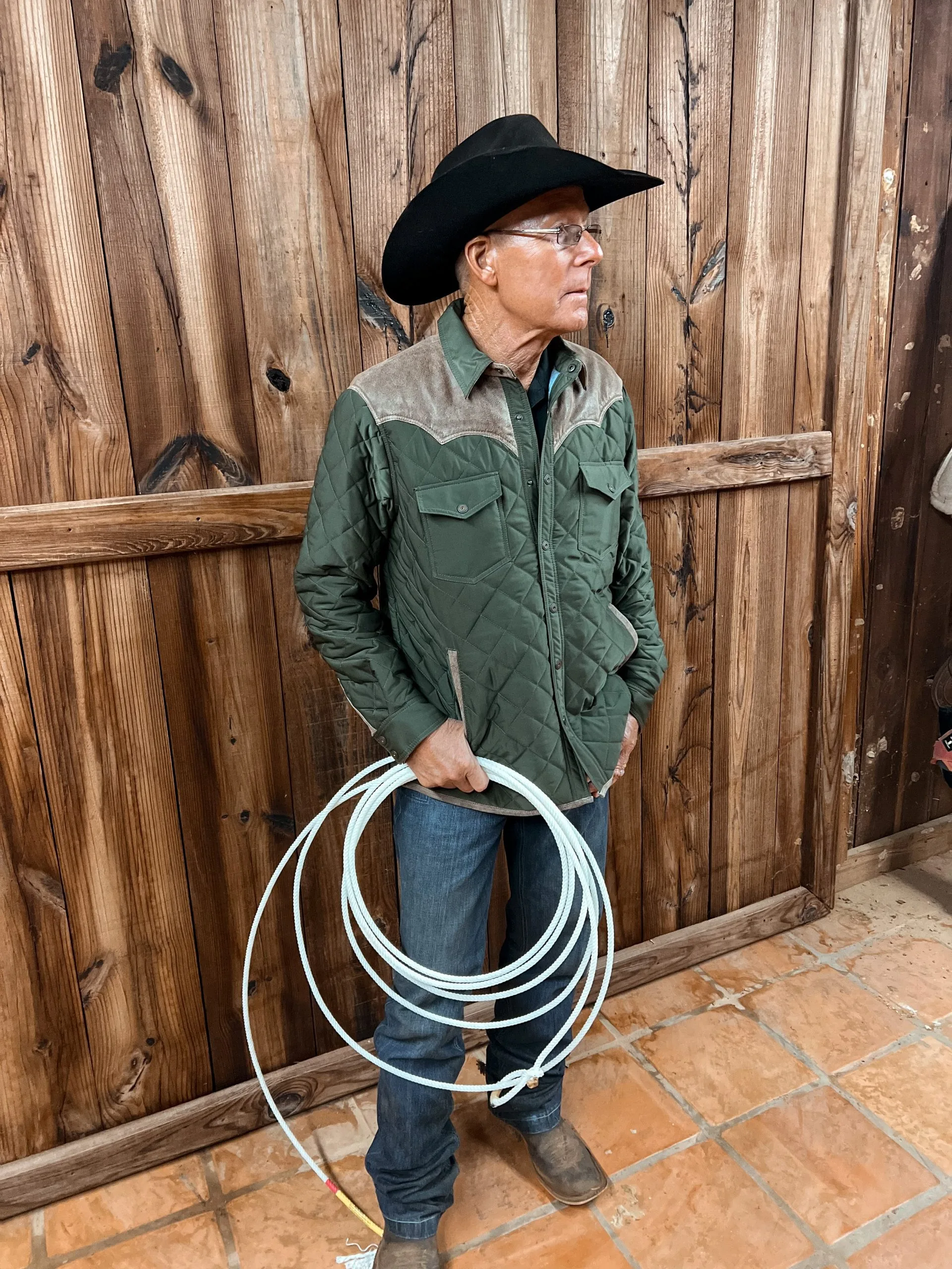 This quilted canvas jacket is great for trail blazing. It features suede yokes waist trim pocket trim and cuff trims. This insulated jacket has a snap front point collar two chest flap pockets with snap closures and two lower vertical side entry pockets. Dry clean only.