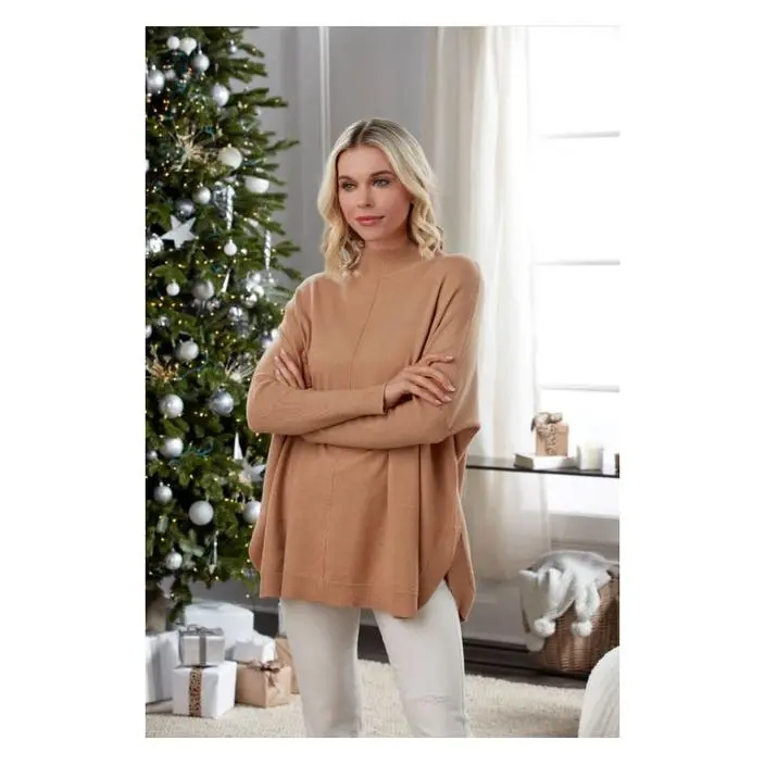 Poly blend knit sweater features center front accent seam, mock neck and curved hem. One size fits most. Measures approximately 27 1/2″ from shoulder to hem.