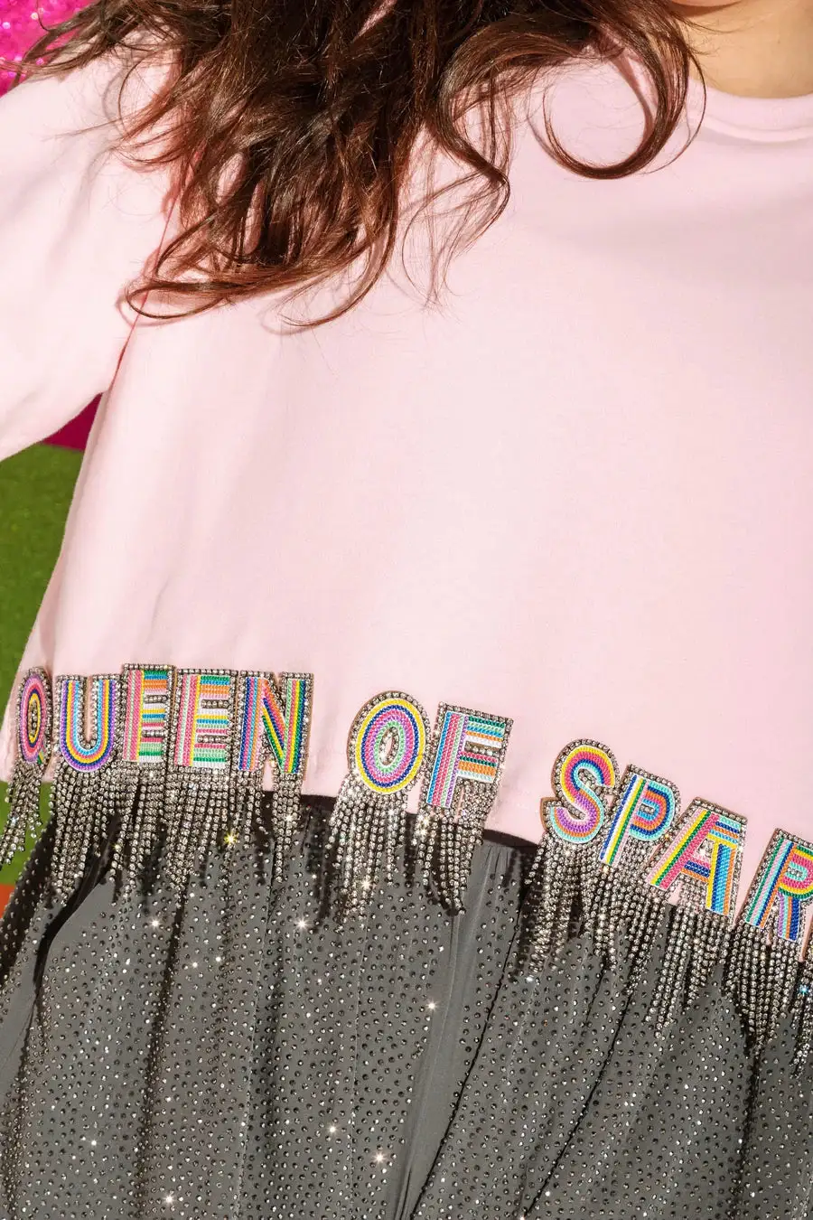 For the girls who love sparkles! Light pink crewneck sweatshirt with “QUEEN OF SPARKLES” rhinestone letters at the bottom hemline and rhinestone fringe. runs true to size, slightly cropped fit.