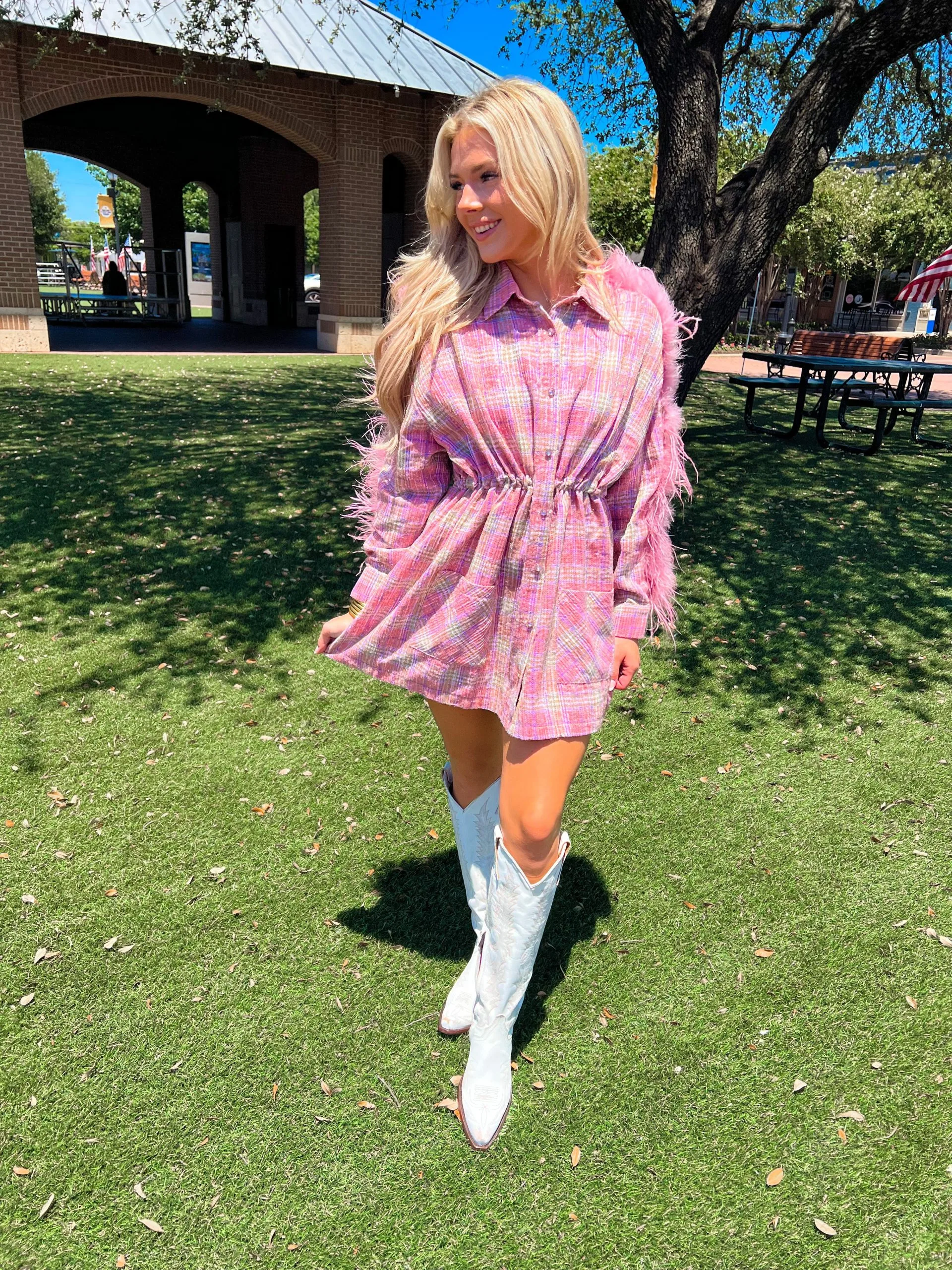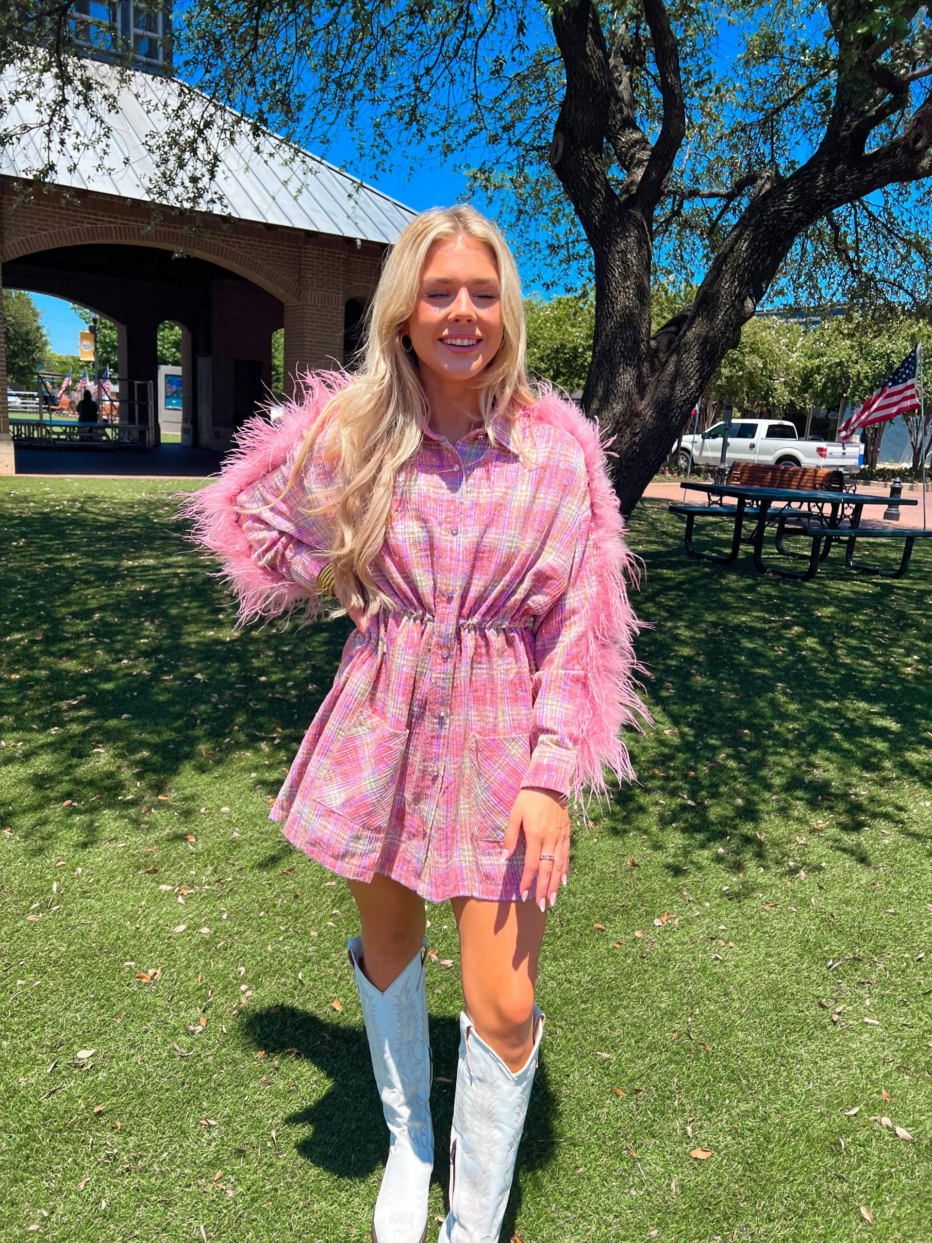 This Queen of Sparkles dress is the queen of versatility! A perfect transitional piece embellished with sequin plaid print and feather detail. Wear her buttoned up as a dress or oversized blazer or unbutton it for a relaxed shacket look! Elastic cinched detail on the inside for a fitted or relaxed look!