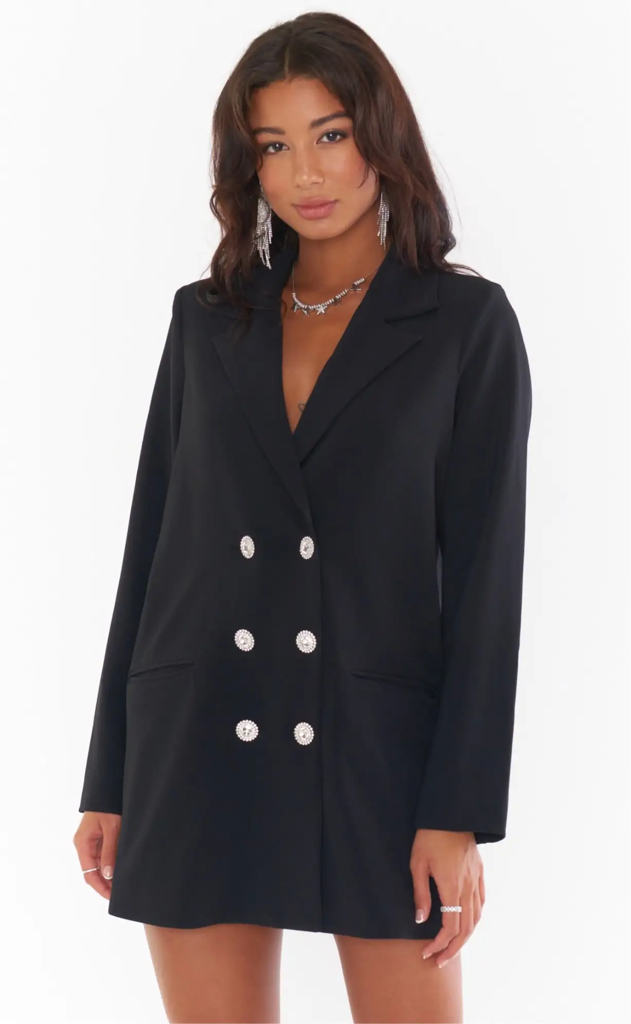 What says glam style more than a little bling? This little black dress is your new event go to! A blazer style mini decorated with a jeweld button front. Style her up with heels and a clutch.