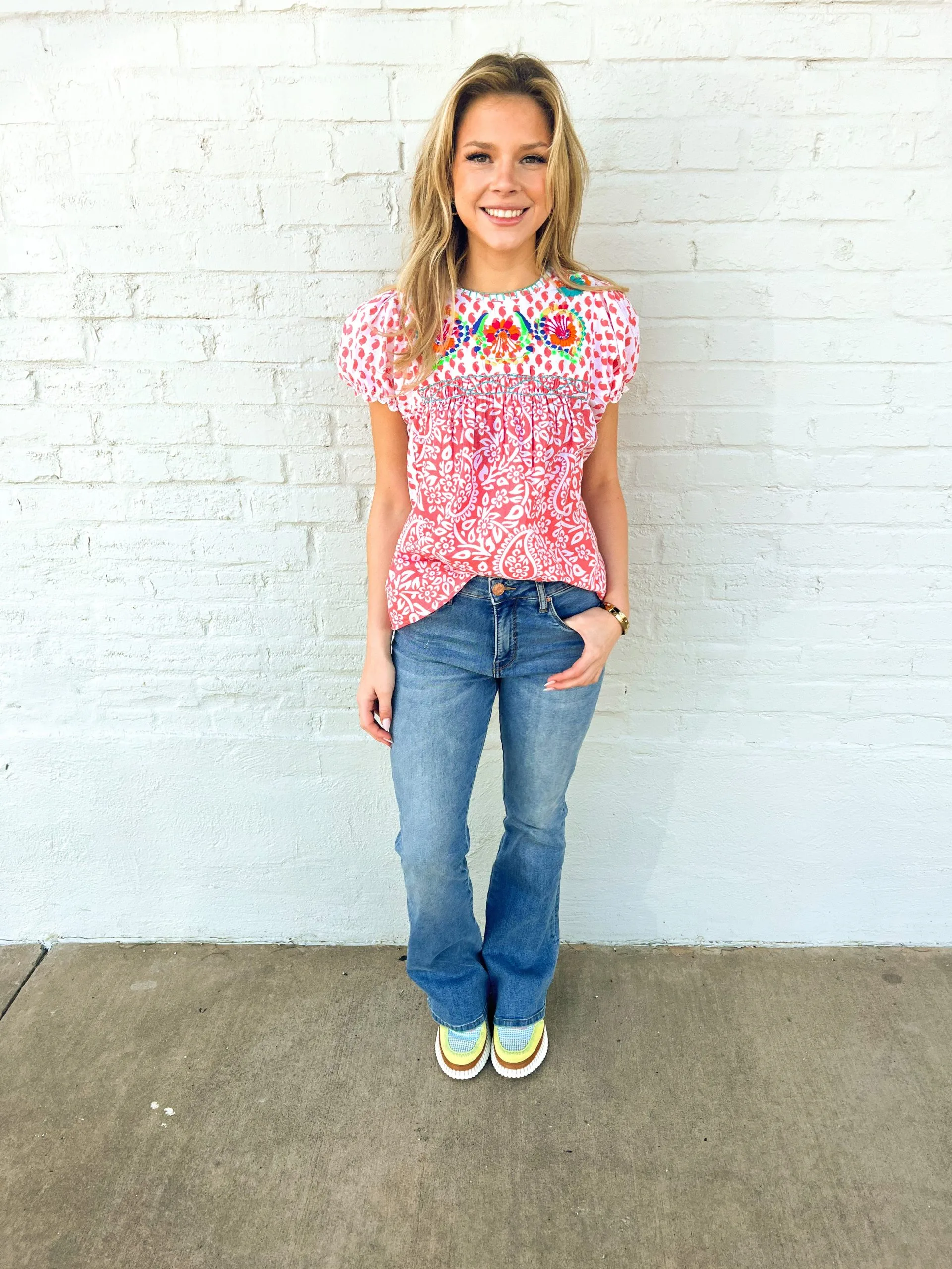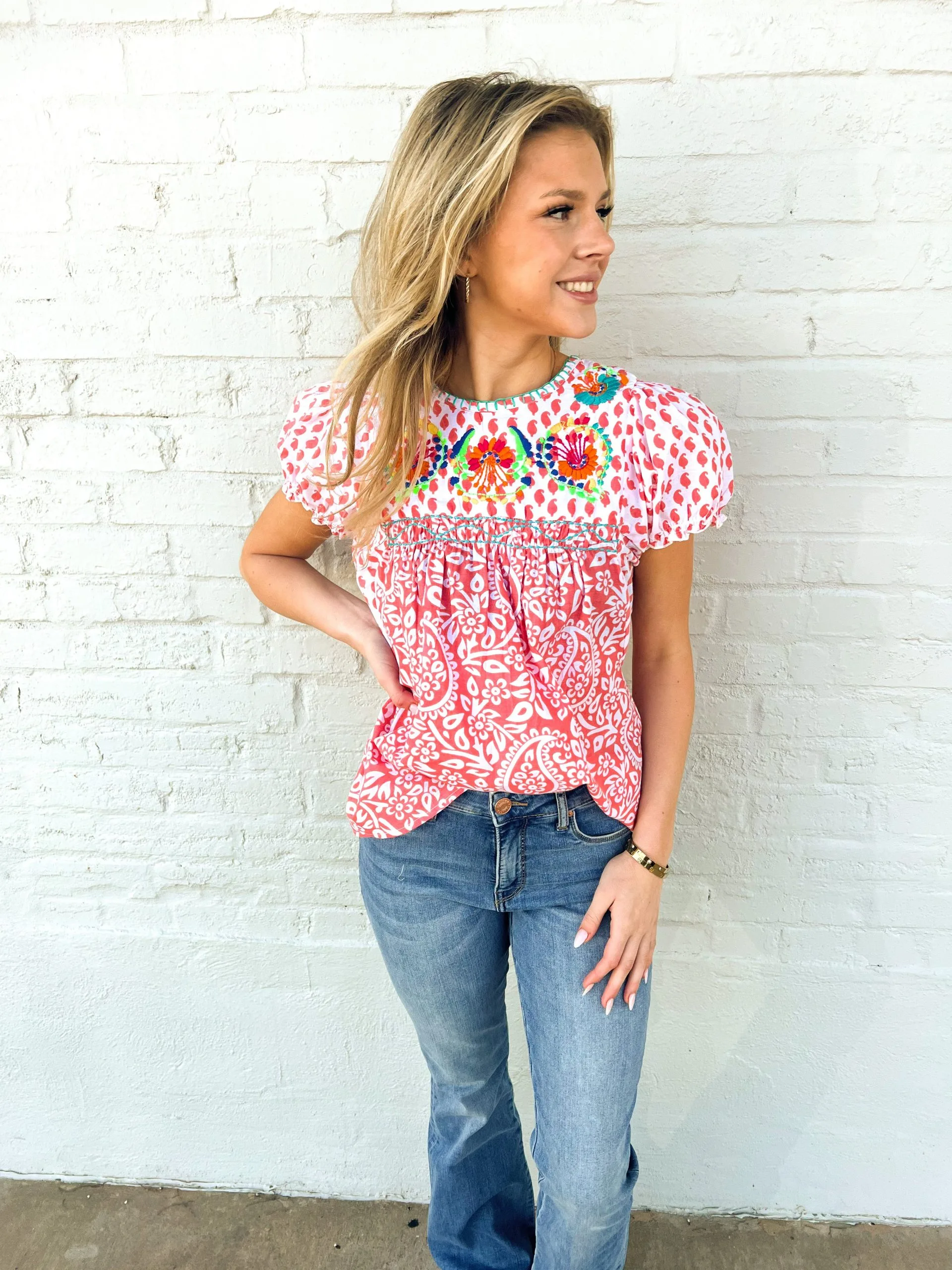 Make a cheerful statement in the Regina Top by Sister Mary! This adorable top is a must-have for any spring wardrobe. The darling salmon and white paisley print brings a pop of fun to your ensemble, while the teal detailed stitching at the chest stands out with vibrancy. There’s also a beautiful colorful embroidered design at the upper chest that adds an extra special touch and mirrors traditional style standards. With its light weight breathability and sweet charm, you can enjoy feeling cute and happy all day long in this top!