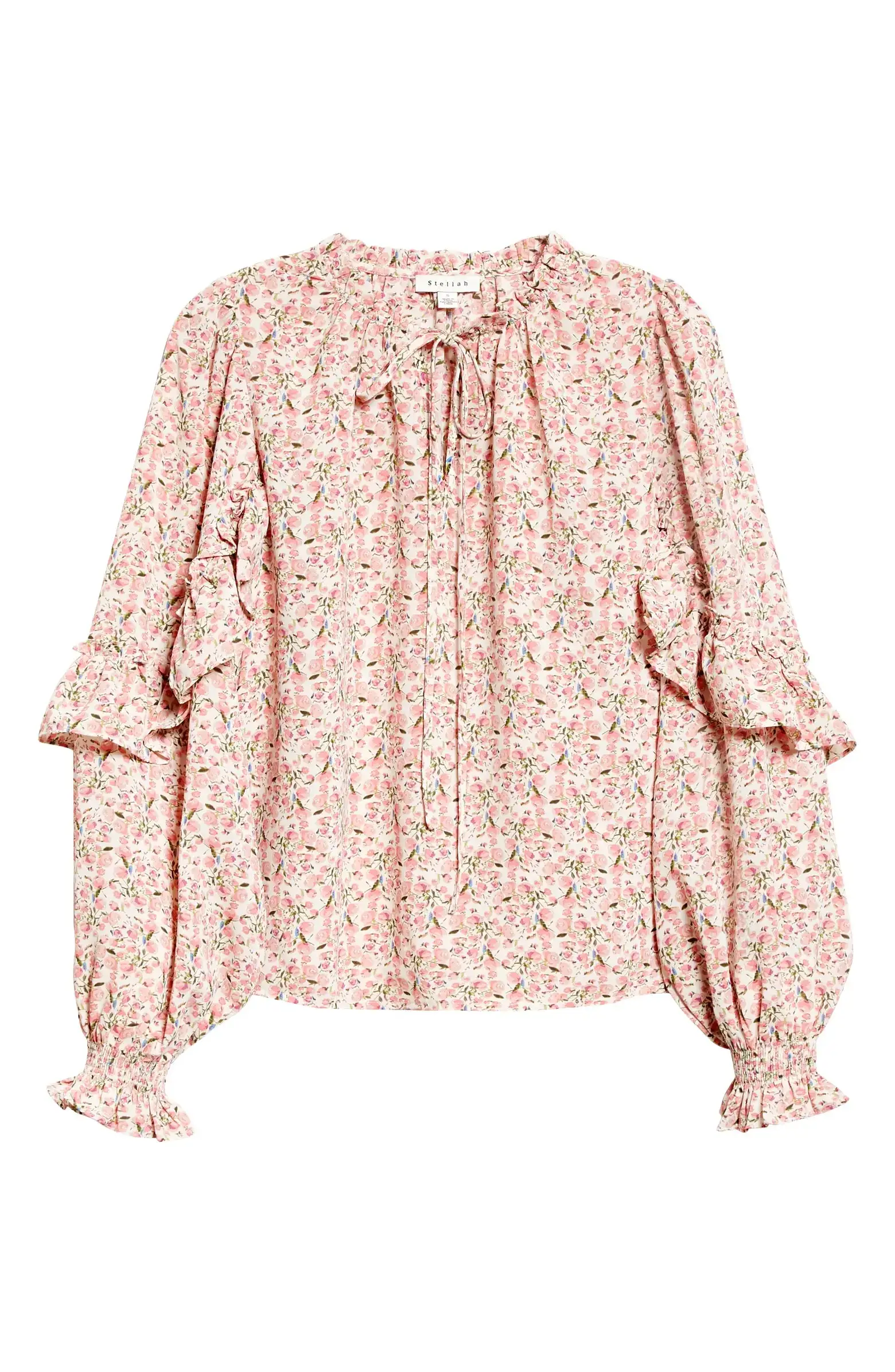 Floral Tie neck ruffle sleeve blouse with vintage style floral pattern detail.