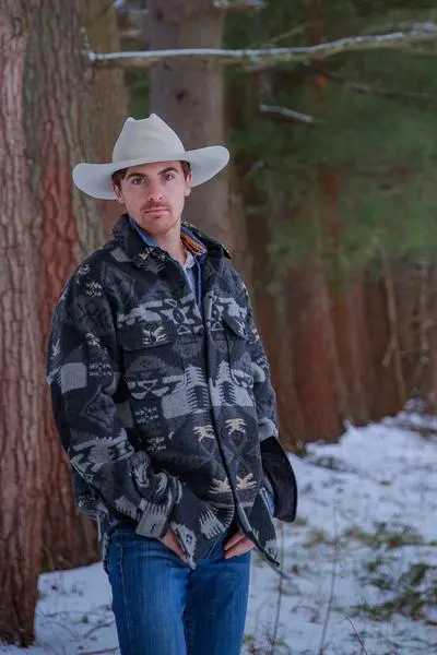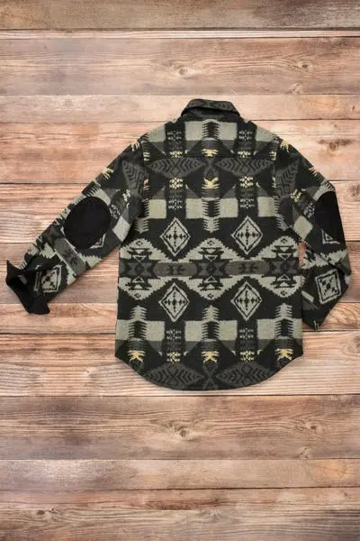 A men’s shirt in a graphite colorway with an all-over blanket pattern with button closures and black faux suede elbow patches.